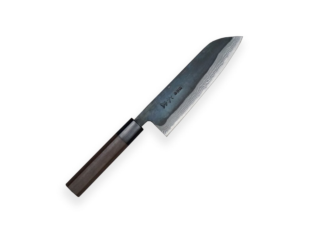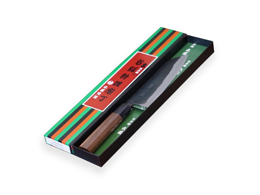 Japonský kuchařský nůž Kamagata/Santoku ze série KIYA Suminagashi Black 11-layers s ostrým jádrem z japonské oceli Takefu V special grade a oktagonovou rukojetí ze santalového dřeva. Ideální nůž pro práci s masem, rybami, zeleninou a ovocem. Délka ostří 170 mm.
