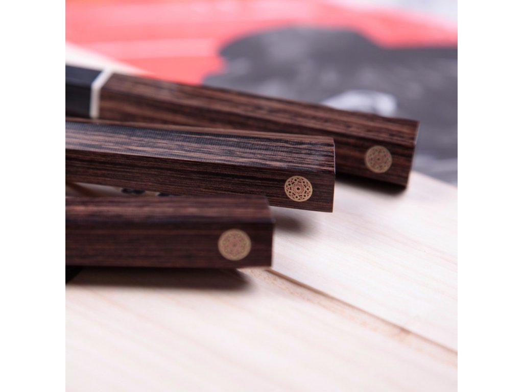 7-hranná rukojeť v japonském stylu poskytuje perfektní kontrolu nad řezem a efektivní podporu při krájení. Ebenové dřevo pakka-wood je díky vysoké vrstevnatosti přirozeně odolné a tvarově stabilní. Ozdobný čep rukojeti je decentní asijsou zdobnou metodou. Dokonalé vyvážení nože přináší komfort a zamezí únavě ruky. Nože Kanetsugu ZUIUN plně uspokojí vaši touhu po precizním nástroji japonského původu.