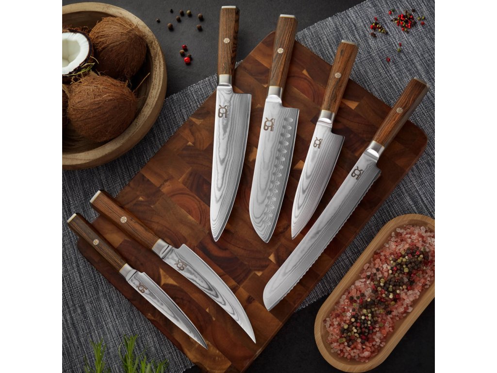 Nůž šéfkuchaře Chef/Gyuto 152 mm série SOK Cocobolo White Damascus je ideální pro krájení, plátkování, čištění a kolébkové krájení masa, ovoce, zeleniny a bylinek. Kuchařský nůž v japonském stylu z damascénské oceli VG10, s rukojetí z exotického dřeva Cocobolo.