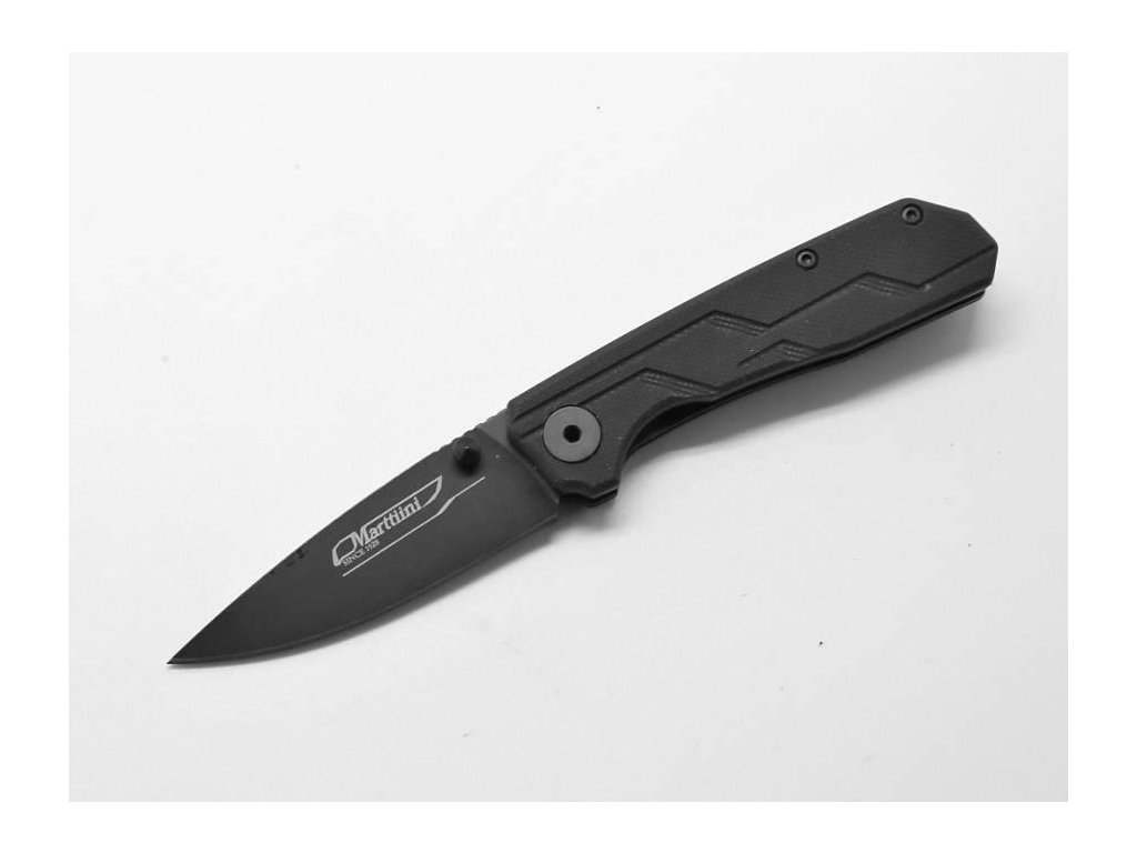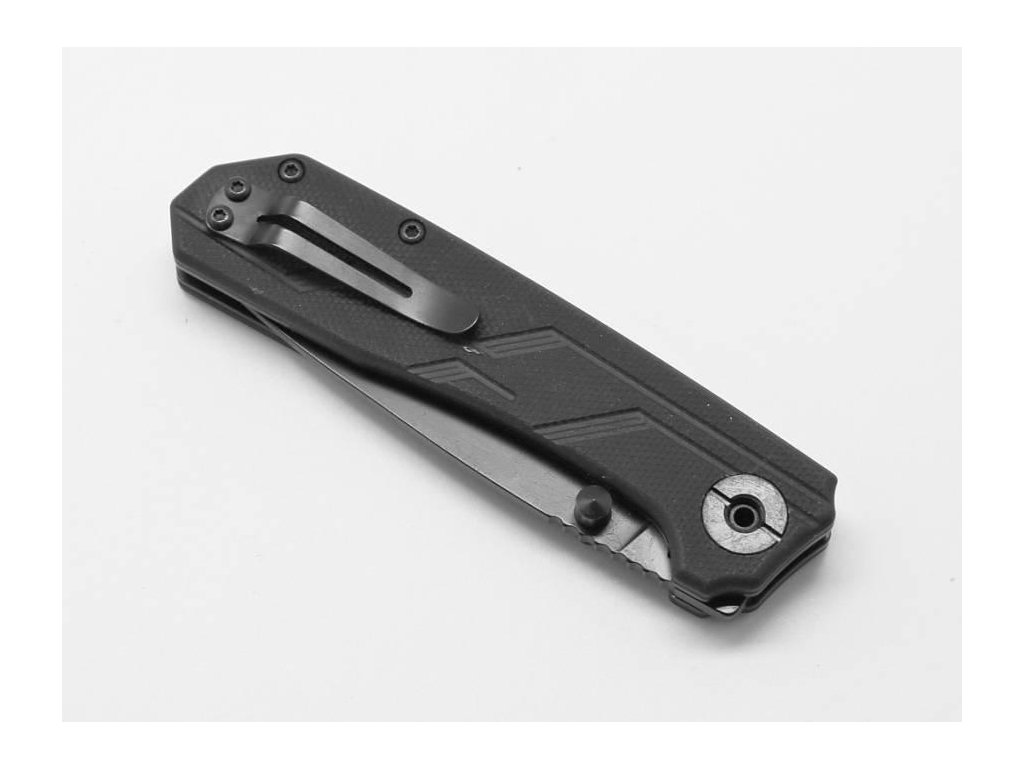 Kapesní zavírací nůž s černěnou čepelí z houževnaté oceli 420 a pojistkou liner-lock. Střenky z materiálu G10, klip na opasek či kapsu, kolíček na otevření jednou rukou.