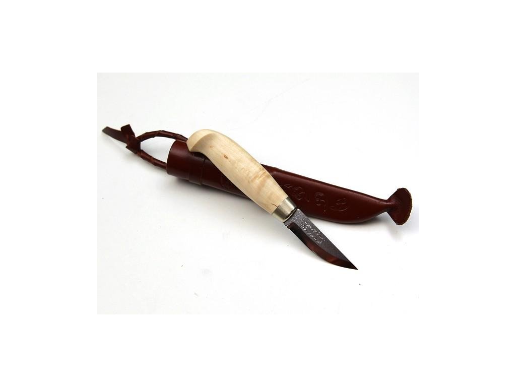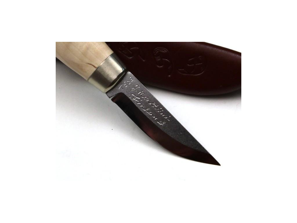 Nůž s pevnou čepelí. Délka čepele nože 6.5cm, celková délka 17 cm. Čepel nože 2,5 mm silná z karbonové nožířské oceli CARBONIX T508. Střenka z mořené, povrchově neupravené břízy, bronzové osazení. Tmavé kožené pouzdro s vytlačeným emblémem a koženým opaskovým závěsem.