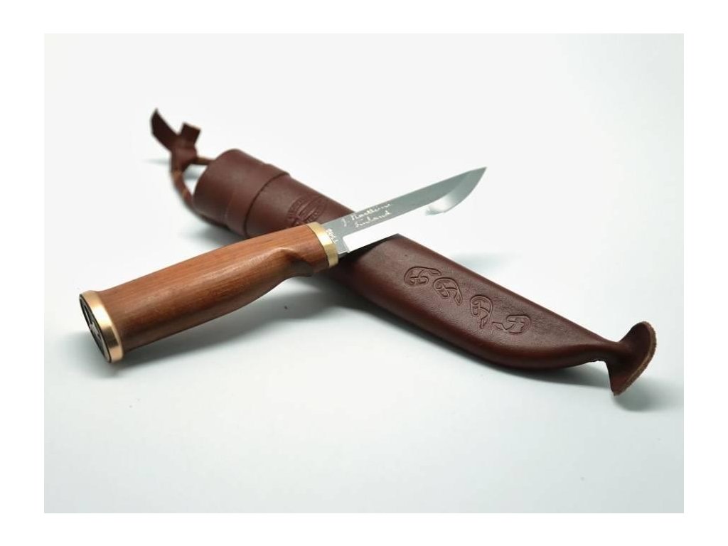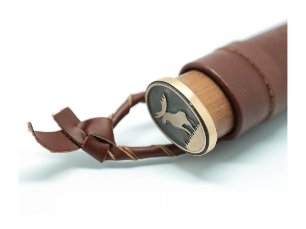 Finský nůž s pevnou čepelí a dřevěnou střenkou, zakončenou bronzovým motivem losa. Čepel z oceli Carbonix T508, střenka z tvrdého, tepelně opracovaného dřeva. Délka 200/85mm. Kožené pouzdro.