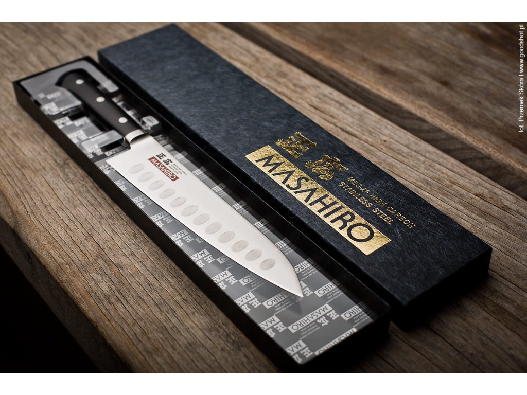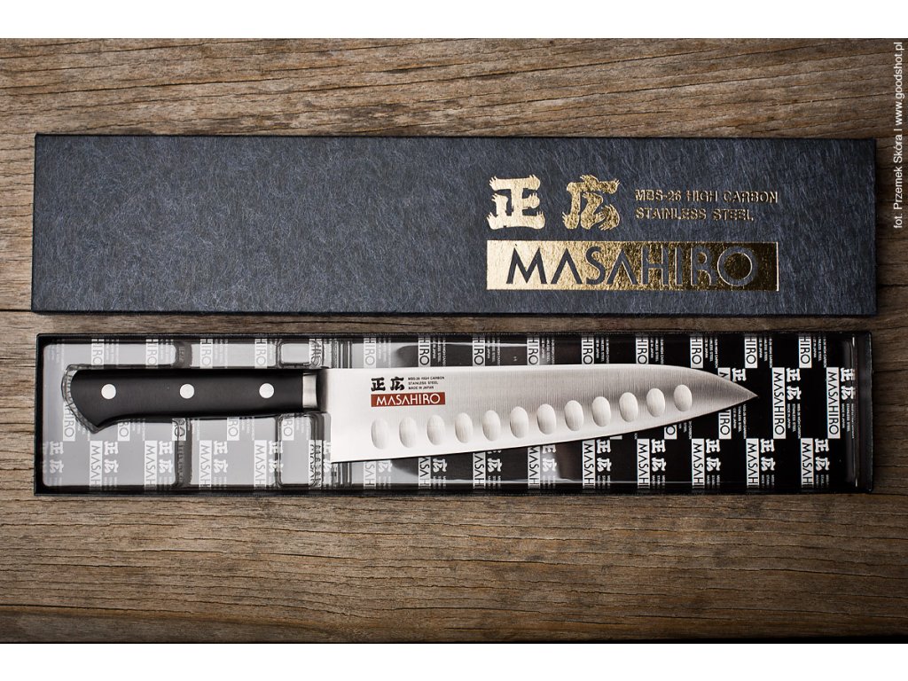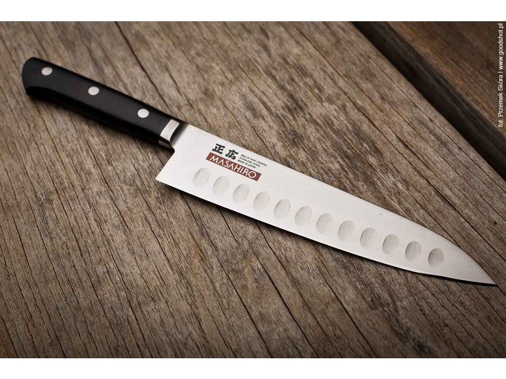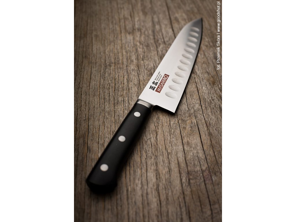 Masahiro MV-H Šéfkuchař Dimple je jedním z nejčastěji volených nožů do kuchyně, a to jak profesionálními, tak amatérskými kuchaři. Charakteristický tvar nože, který pochází z francouzské kuchyně, se používá k mnoha kuchyňským pracím a název kuchařský nůž podtrhuje skutečnost, že je nepostradatelným nástrojem každého kuchaře. Nůž je velmi lehký a rukojeť dobře padne do malé i velké ruky. Díky dokonalému vyvážení čepele a rukojeti umožňuje rytmický, velmi účinný kývavý pohyb po povrchu při krájení nebo sekání různých produktů.