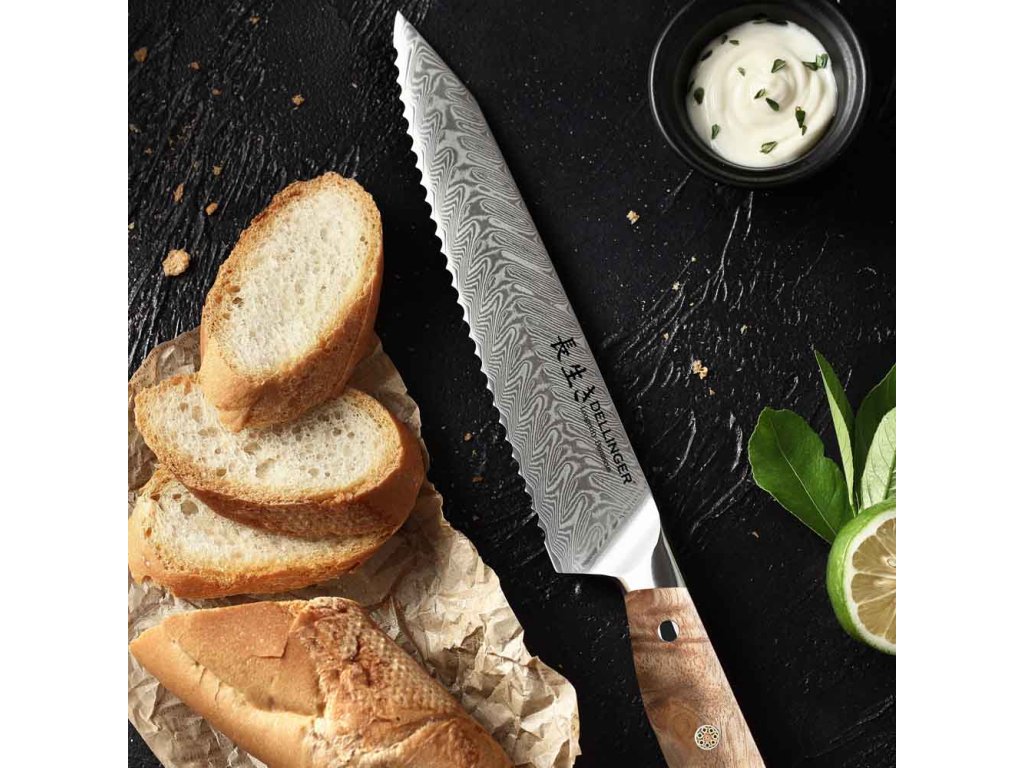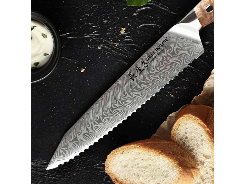 Nůž na chléb apečivo Bread ze série Dellinger Longevity Damascus Edition s damaškovou čepelí a jádrem z oceli VG-10 a rukojetí z přírodního dřeva platanu Figured Sycamore. Tento nůž s dlouhou čepelí s broušenými zuby na pravé straně je určen na krájení pečiva bez drobení a mačkání surovin. Délka damaškové čepele 210 mm.