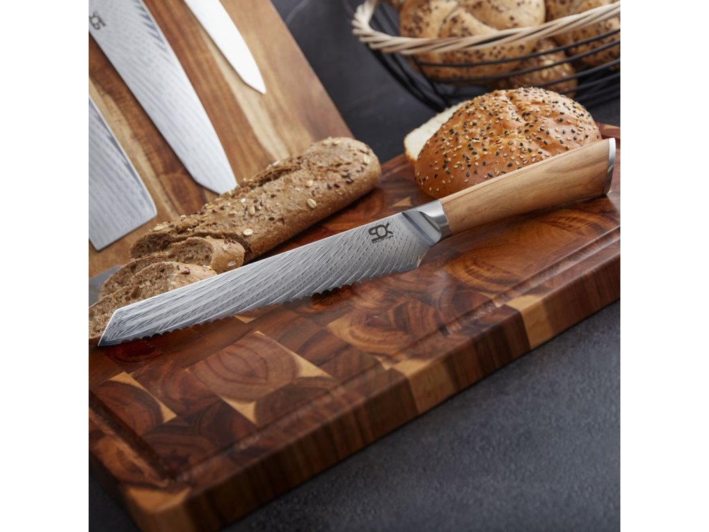 Nůž na pečivo Bread ze série SOK Olive Sunshine Damascus z damaškové oceli VG10. Nůž je určený pro krájení pečiva bez drobení a deformace surovin. Rukojeť je vyrobena z olivového dřeva. Délka ostří 240 mm.
