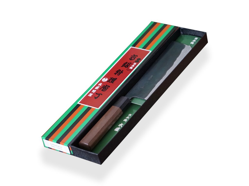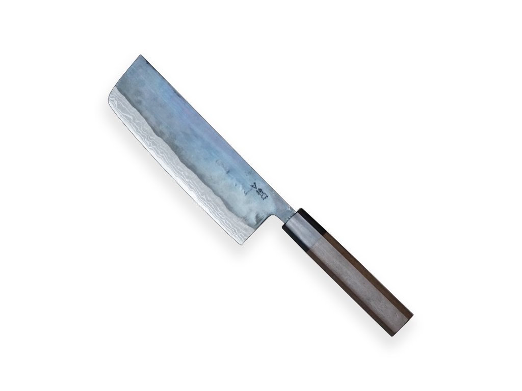 Japonský kuchařský nůž na zeleninu Nakiri ze série KIYA Suminagashi Black 11-layers s ostrým jádrem z japonské oceli Takefu V special grade a oktagonovou rukojetí ze santalového dřeva. Ideální nůž krájení zeleniny a ovoce. Délka ostří 170 mm.