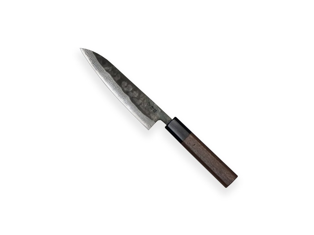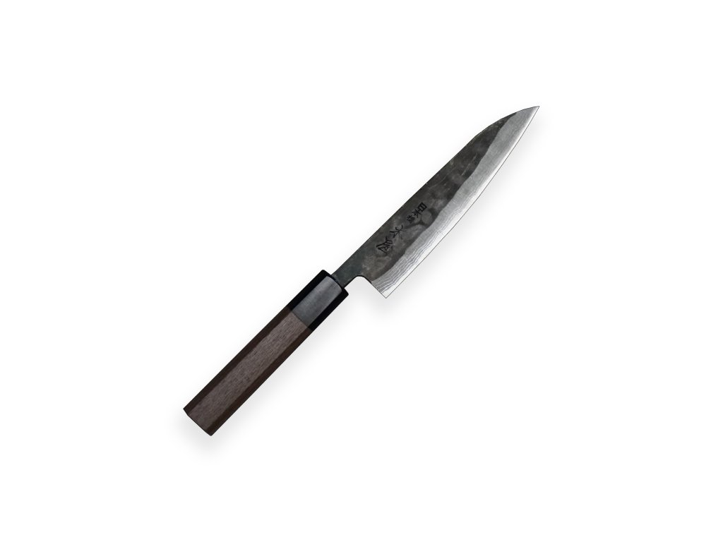 Japonský kuchyňský nůž Petit ze série KIYA Suminagashi Black 11 layers s ostrým jádrem z japonské oceli Takefu V special grade a oktagonovou rukojetí ze santalového dřeva. Ideální nůž na okrajování ovoce a zeleniny nebo špikování masa. Délka ostří 140 mm.