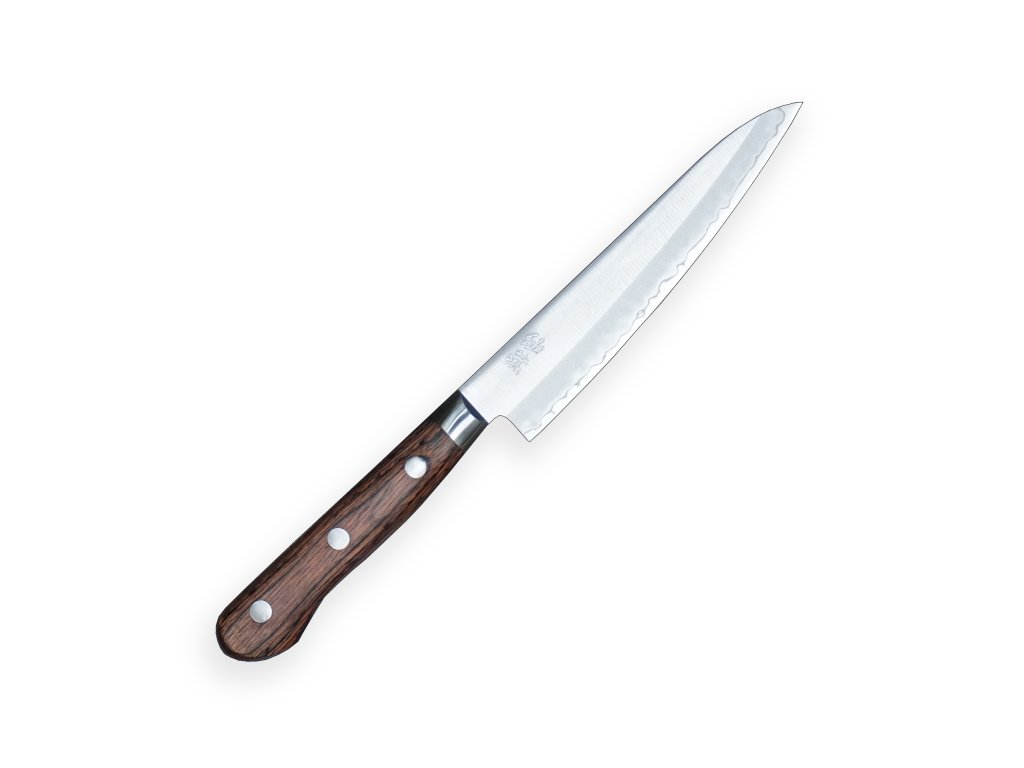 Japonský univerzální nůž Petty ze série Suncraft SENZO CLAD z 3 plátové oceli AUS-10 s rukojetí z materiálu Pakka-wood. Ideální pro krájení zelených fazolí nebo jiné menší zeleniny a ovoce. Je vhodný také pro špikování a krájení masa. Délka ostří 135 mm.