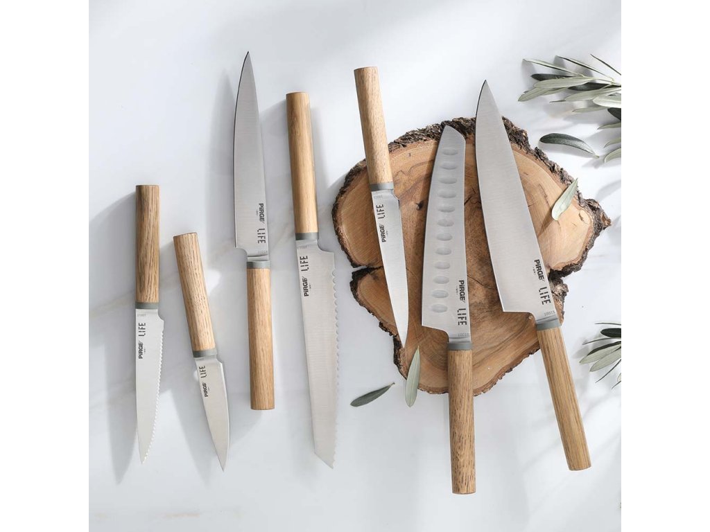 Nože ze série PIRGE Life jsou vizuálně působivé, extrémně lehké a skvěle padnou do ruky jak pravákům, tak levákům. Každý kuchař ocení nejen jejich jedinečný design, ale i dokonalou ergonomii oválné rukojeti, která zajišťuje maximální komfort a kontrolu při krájení. Navíc jsou ekonomicky nenáročné, což z nich činí skvělou volbu pro každou kuchyni.