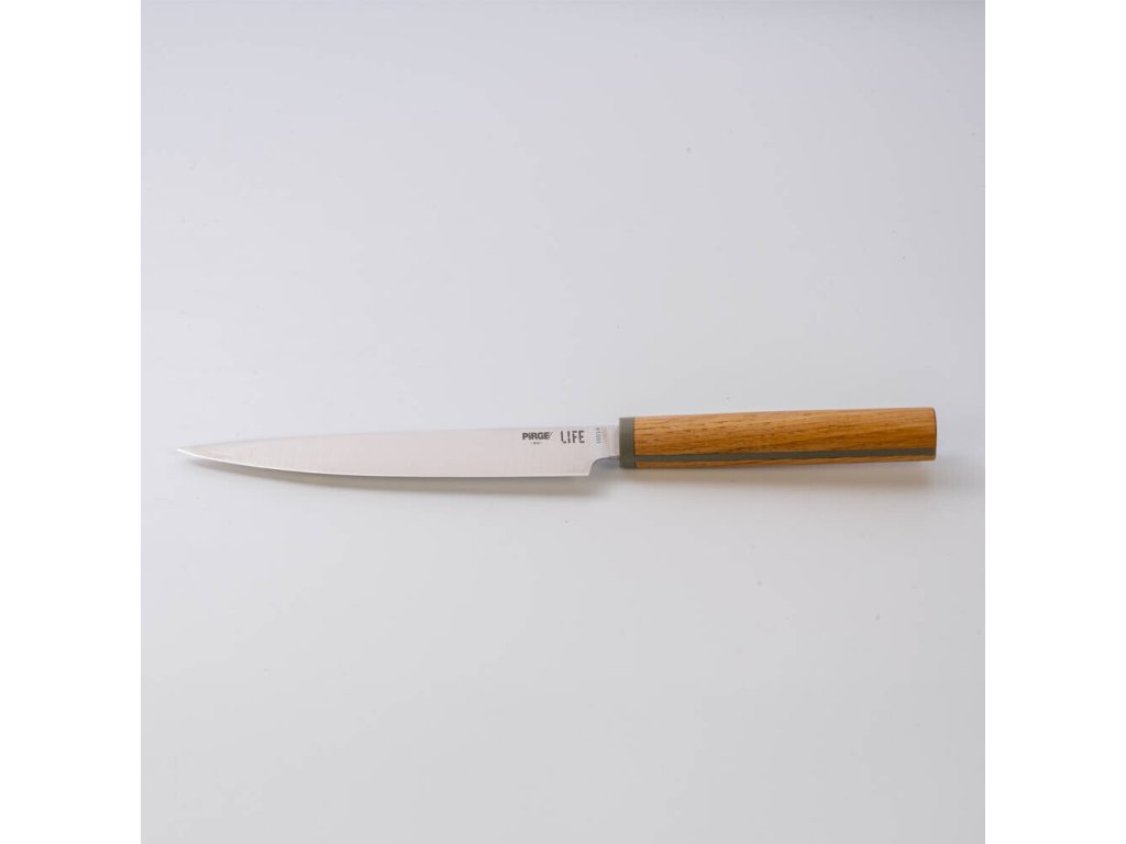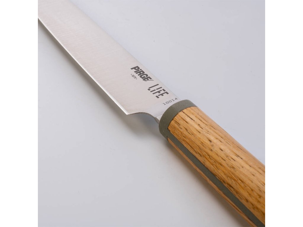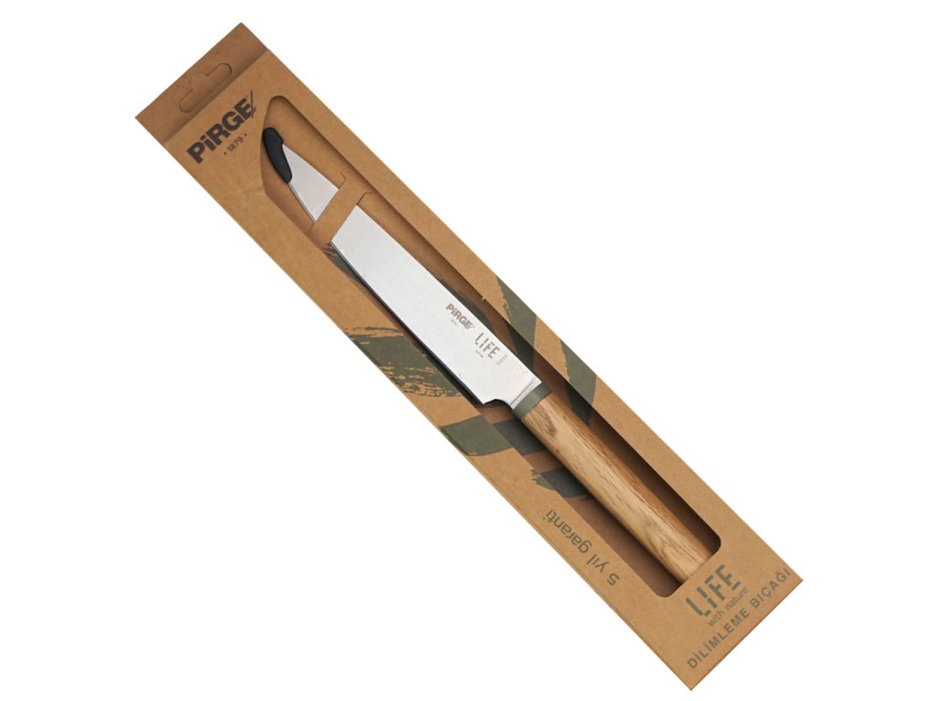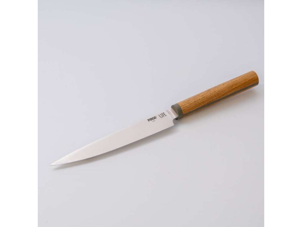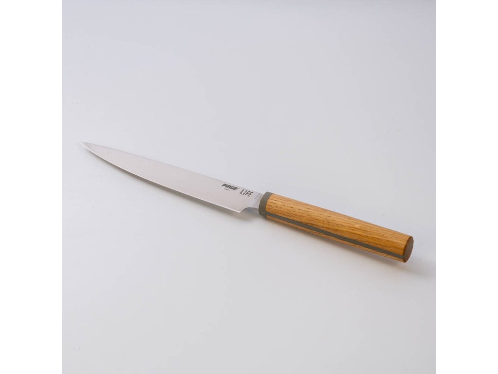 Plátkovací nůž Slice ze série PIRGE Life s čepelí z německé oceli 1.4116. Tvrdost jádra 54 HRC. Oválná rukojeť v kombinaci akáciového dřeva, olivových pecek a polymeru. Nůž je ideální pro krájení, plátkování, čištění a kolébkové krájení masa, ovoce, zeleniny a bylinek. Délka čepele 160 mm.