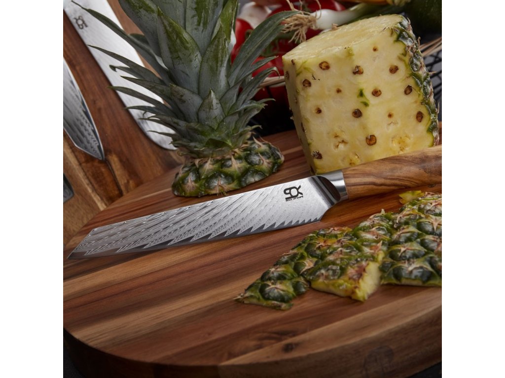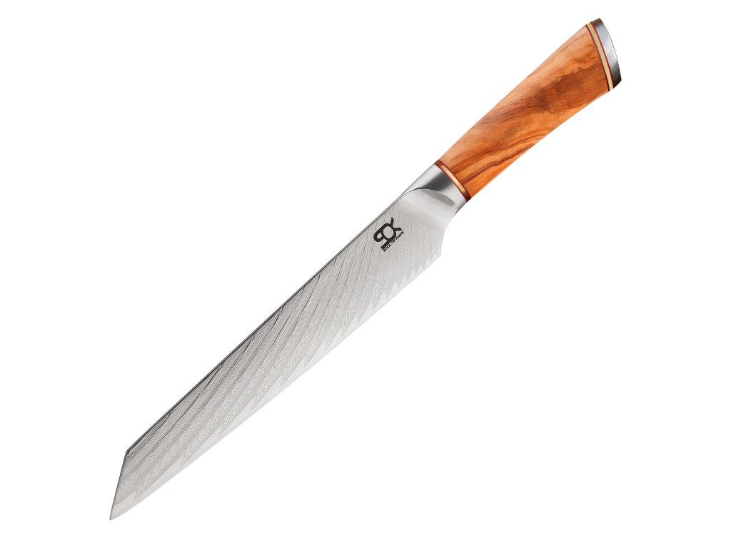 Plátkovací nůž Slice ze série SOK Olive Sunshine Damascus z damaškové oceli VG10. Tento nůž umožňuje krájení na velmi tenké plátky. Rukojeť je vyrobena z olivového dřeva. Délka ostří 190 mm.