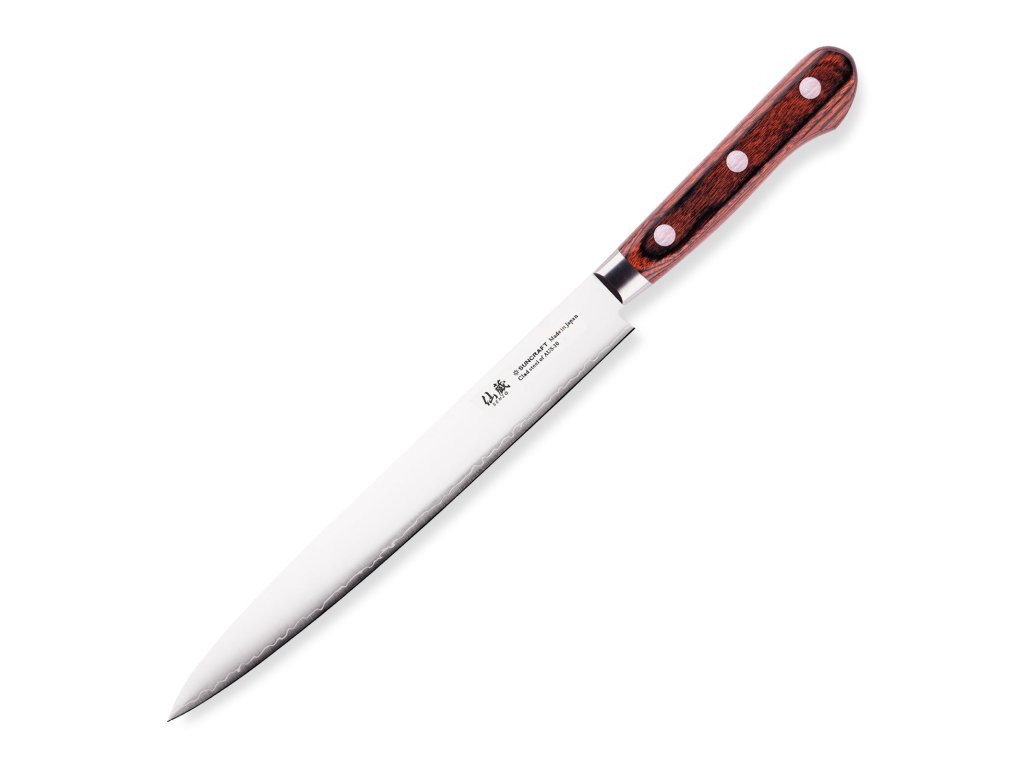 Japonský plátkovací nůž Slice ze série Suncraft SENZO CLAD z 3 plátové oceli AUS-10 s rukojetí z materiálu Pakka-wood se třemi nýty. Precizní nůž pro jemné plátkování masa. Délka ostří 240 mm.