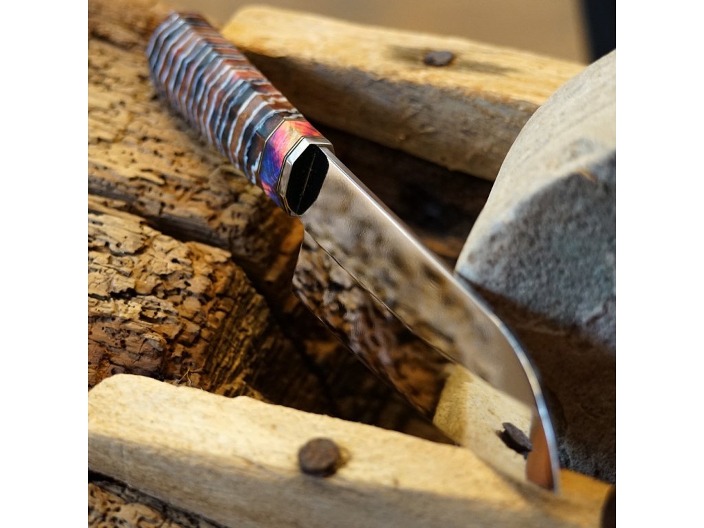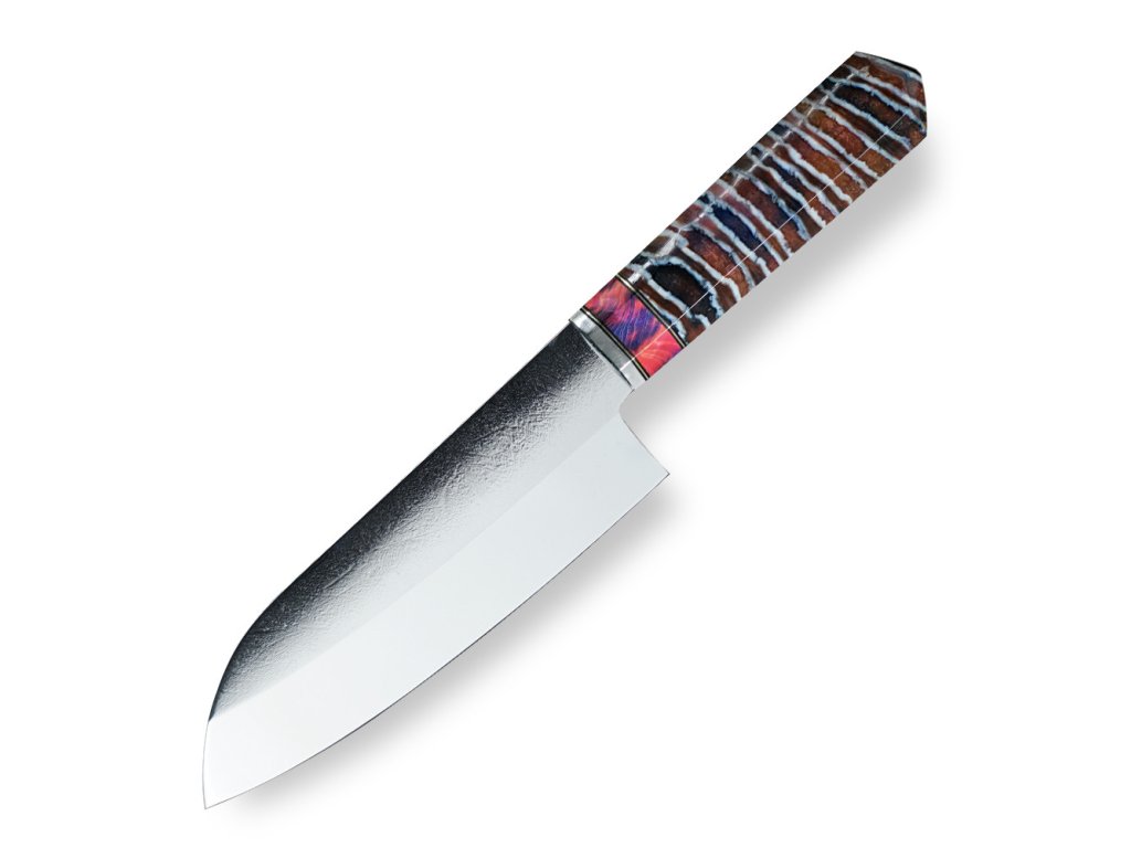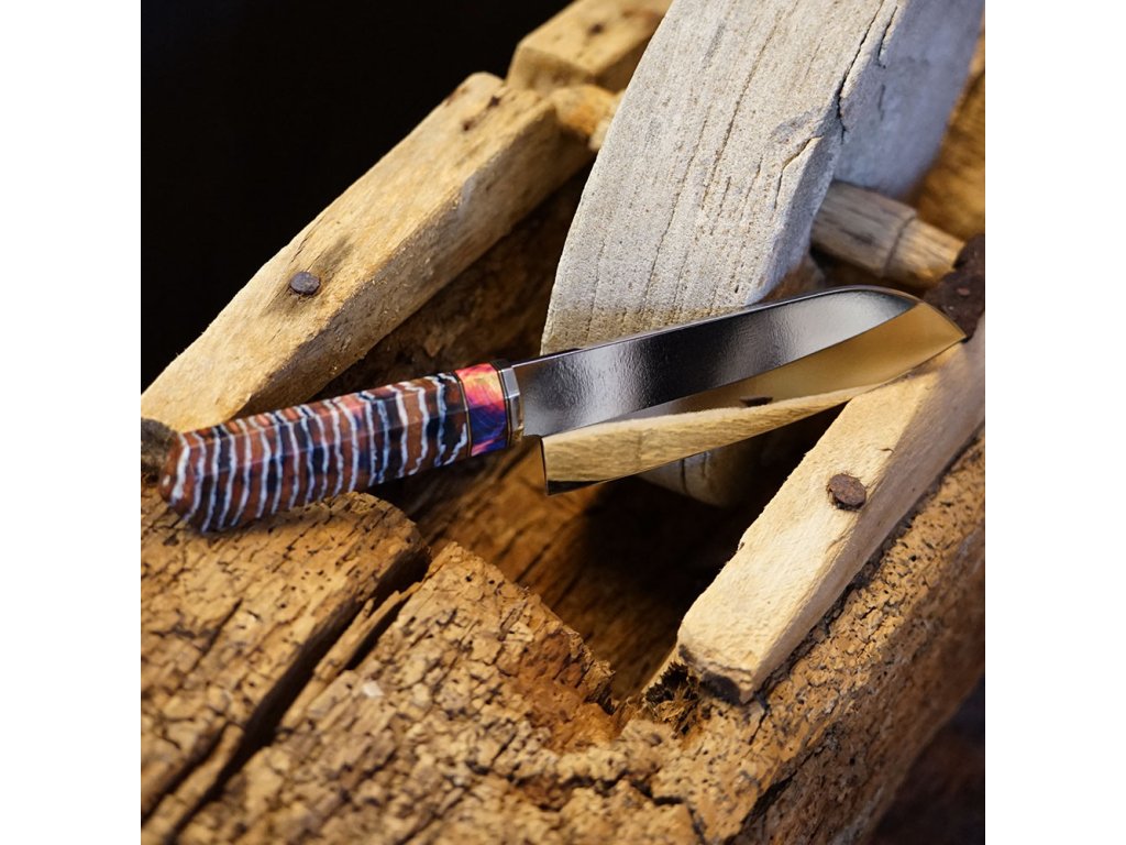 Ručně vyrobený nůž z manufaktury Dellinger se stane věrným partnerem každého amatérského či profesionálního kuchaře. Nabízí kombinaci velmi ostré zrcadlové čepele a překrásné rukojeti z mamutích fosilií. Bezvadné a promyšlené ruční zpracování dává tomuto noži punc dokonalosti. Krájení, plátkování, čištění masa, ovoce a zeleniny – nic nebude pro tento jedinečný nůž japonského tvaru problémem.