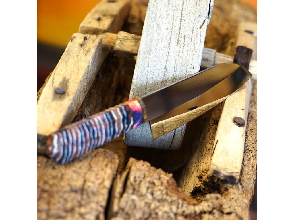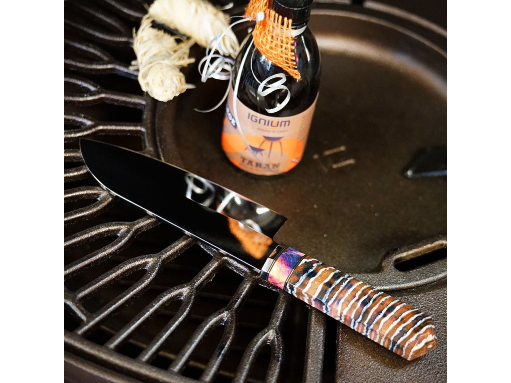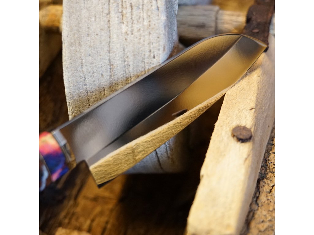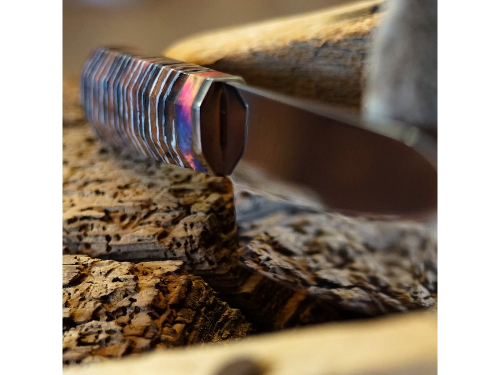 Ergonomická rukojeť západního stylu je vyrobena z vzácných fosilií mamutího zubu a doplněna kroužkem ze stabilizovaného dřeva. Pečlivě ručně leštěná, ergonomicky tvarovaná a navržena pro vynikající ruční ovládání.