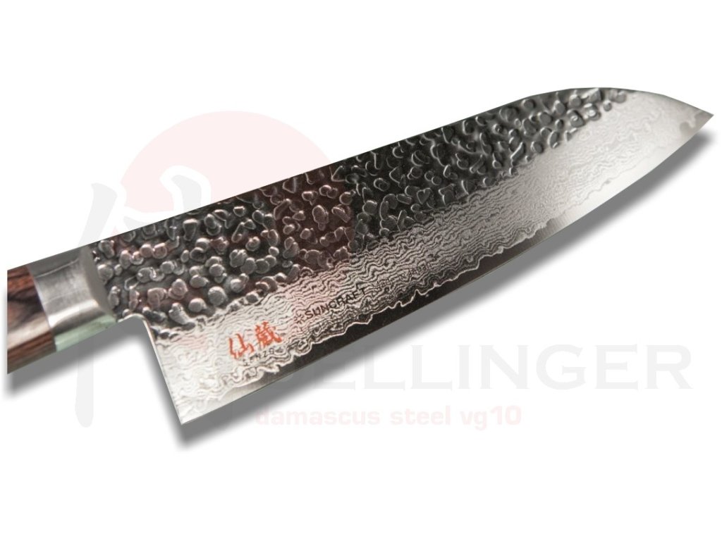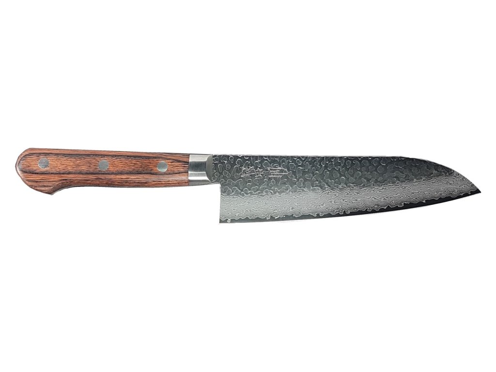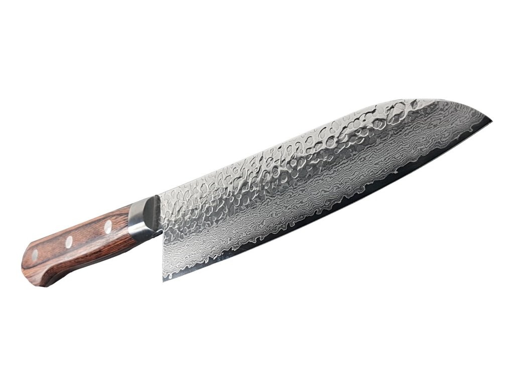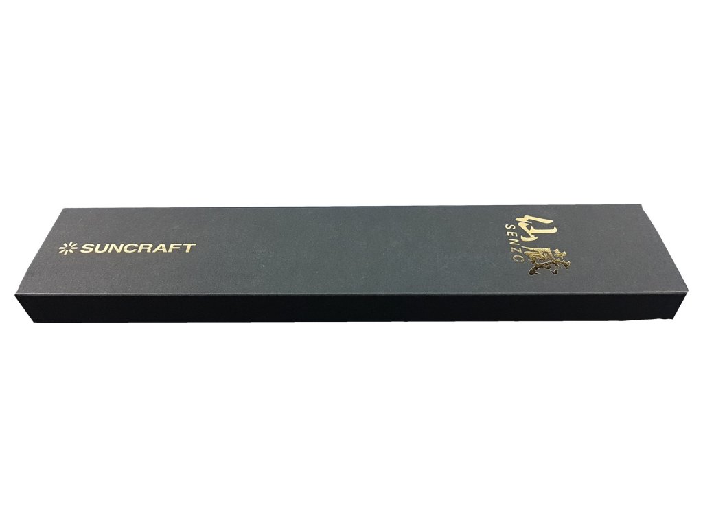 Extrémně ostrý japonský nůž Santoku ze série Suncraft Senzo Universal Tsuchime Damascus s jádrem z oceli VG-10 vloženým mezi 66 vrstev damaškové oceli. Nůž Santoku je bezohledný kuchyňský válečník, který je připraven na všechna vaše přání. Japonské slovo "santoku" se zhruba označuje jako "tři ctnosti", což svědčí o všestrannosti tohoto typu nože a druhu řezů, ve kterých vyniká (řezání, rozkrájení a mletí). Čepel je obvykle kratší než kuchařský nůž s výrazně odlišnou geometrií. Nůž Santoku je často prohlašován za fúzi mezi šéfkuchařským nožem a Nakiri, což vám přináší výhody obou zmíněných. Vyšší faseta snižuje tření, krájení je tak přesnější. SANTOKU je dokonalým společníkem při práci s masem, rybami, zeleninou a ovocem. Nepřekonatelné vlastnosti nože oceníte například při krájení cibule. Ostrost čepele zajistí minimální únik tekutiny a vaše pokrmy budou plné šťávy a vitamínů. Široká čepel vám poskytne tu nejlepší kontrolu při řezání a krájení. Japonské umění, preciznost a nové technologie činí tento nůž z damascénské oceli jedinečným a nenapodobitelným.