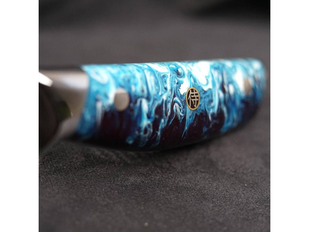 Rukojeť je vyrobena z překrásné epoxidové pryskyřice. Jedná se o průhlednou pryskyřici probarvenou alkoholovými pigmenty, které mohou časem měnit barvu. Navíc je ozdobená středovým mozaikovým nýtem se znakem samurajů. Trojité nýtování zajišťuje dokonalou pevnost, stabilitu a spojení damaškového ostří a rukojeti. Rukojeť je pečlivě ručně leštěná, ergonomicky tvarovaná a navržená pro vynikající ruční ovládání. Speciálně navržený tvar rukojeti je vhodný pro asijský úchop nože. Pryskyřice je voděodolná a zcela bez zápachu, nevyžaduje prakticky žádnou údržbu. Nezačne v průběhu času korodovat, oxidovat, zůstane stejně tvrdá a pevná.