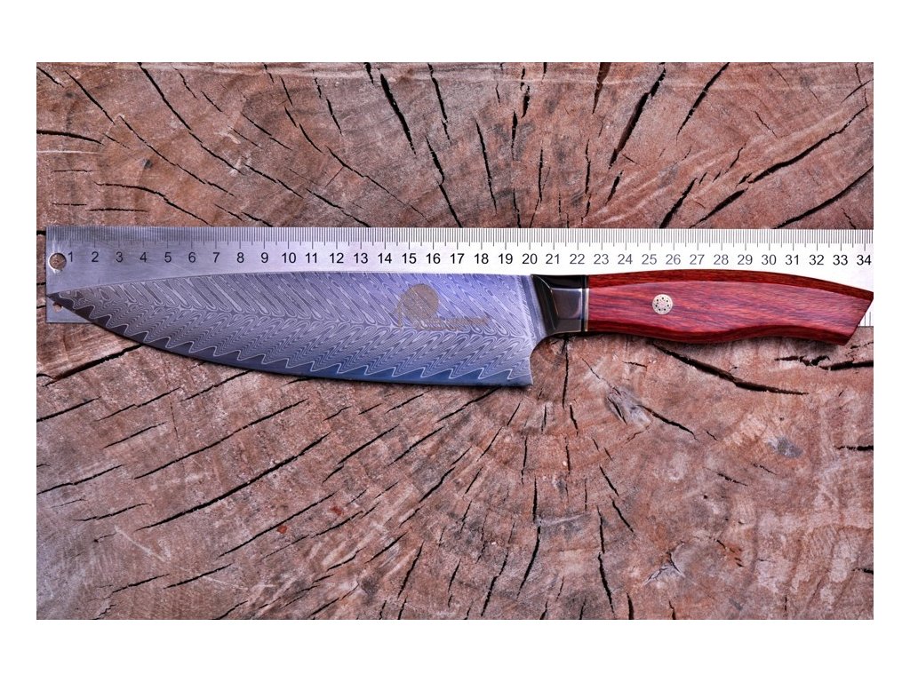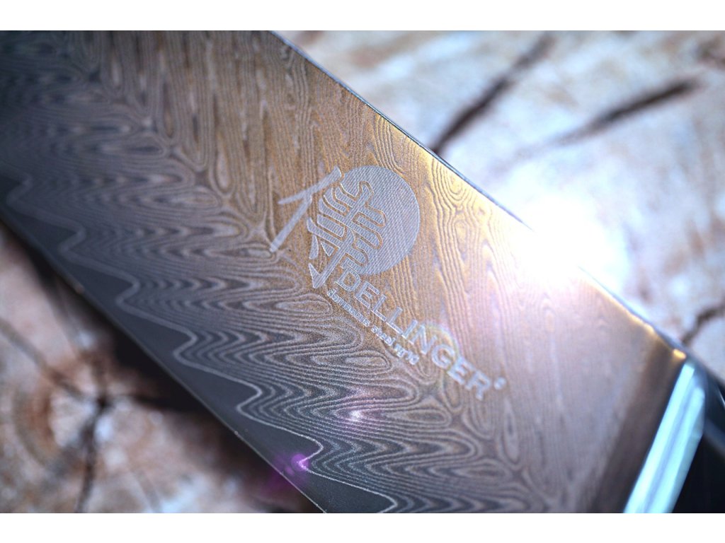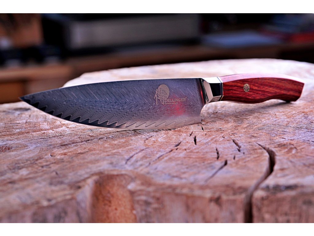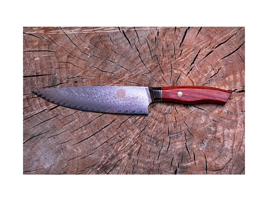 Robustní, velmi ostrý kuchařský z damascénské oceli (damascus steel) s působivým designem a nejvyšší kvalitou. Hřbet nože a ostří se zužují do špičky pro všestranné využití mimořádné řezné síly. Krájení, plátkování, čištění masa, ovoce a zeleniny – nic nebude pro tento jedinečný nůž japonského tvaru problémem.