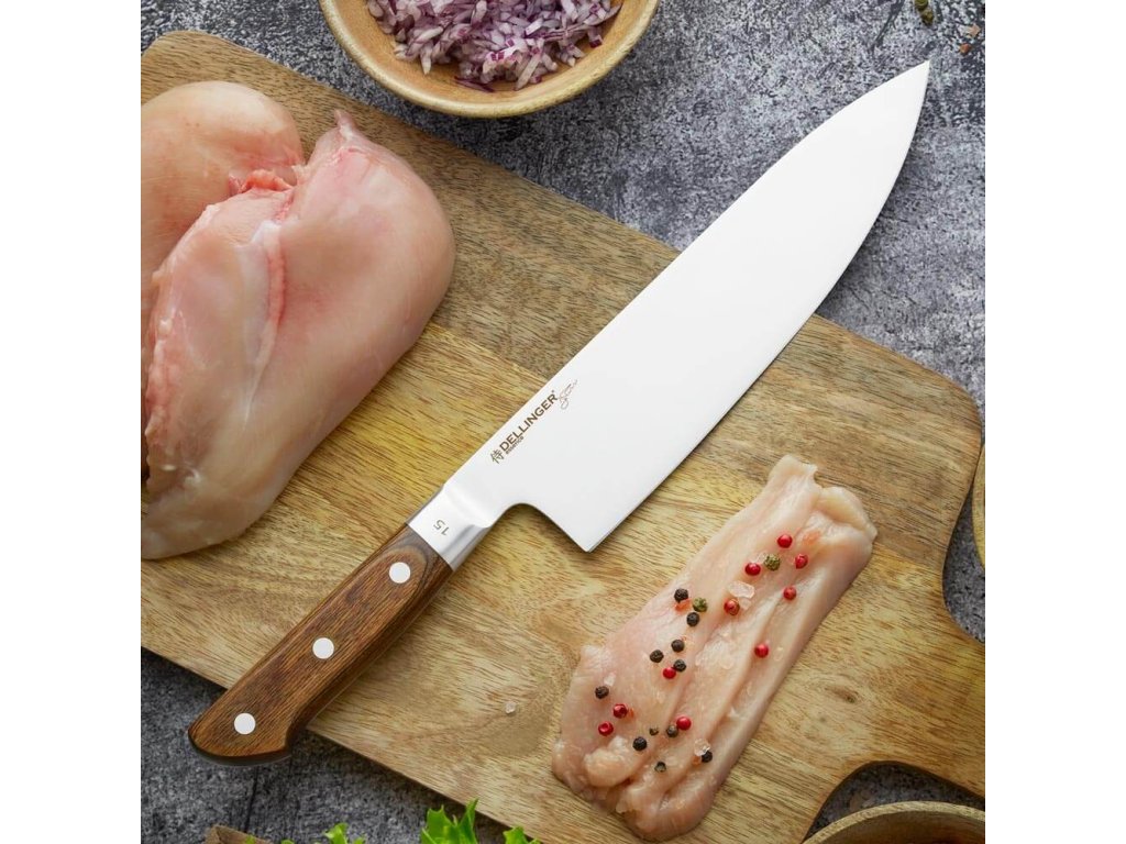 Univerzální nůž šéfkuchaře Chef/Gyuto ze série Dellinger Essence s čepelí z německé oceli 1.4116 a rukojetí ze syntetického dřeva Pakkawood. Nůž je ideální pro krájení, plátkování, čištění a kolébkové krájení masa, ovoce, zeleniny a bylinek. Délka čepele 210 mm.