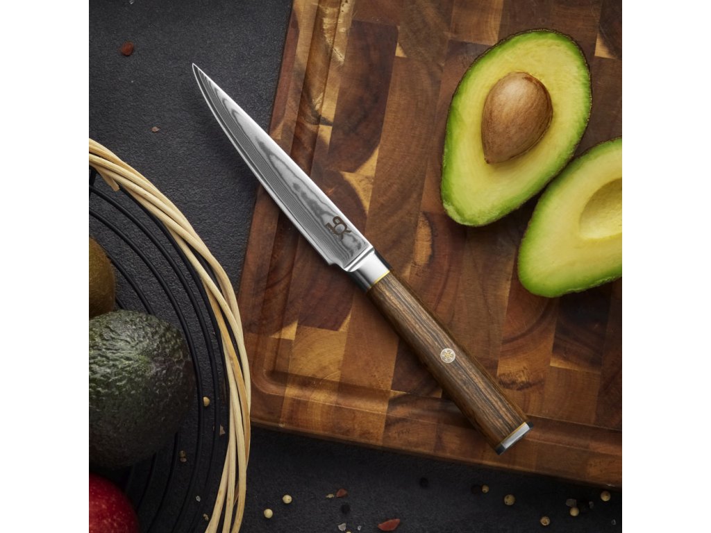 Nůž Utility 128 mm ze série SOK Cocobolo White Damascus. Skvělý pro krájení ovoce a zeleniny bez rozmačkání a deformace. Zvládne také vykosťování, špikování, kuchání ryb a drůbeže a nahradíte jím velký šéfkuchařský nůž. Přesné a čisté řezy, snadno naporcujete menší kusy masa a sýra. Čepel z damaškové oceli VG10, rukojeť z exotického dřeva Cocobolo.