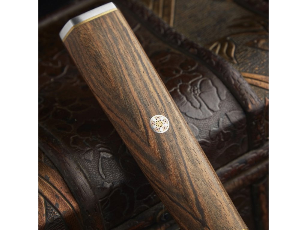 je vyrobena z exotického dřeva Cocobolo, které je vyhledávané pro svou barvu a texturu. Dřevo Cocobolo Cocobolo je vysoce ceněné tropické tvrdé dřevo pocházející ze střední Ameriky, zejména z Mexika, Panamy, Kostariky a Nikaraguy. Cocobolo je extrémně tvrdé a husté dřevo s přirozeným obsahem oleje, který poskytují vynikající odolnost vůči vodě a vlhkosti. Je velmi stabilní a dobře odolává změnám vlhkosti a deformacím. Kvůli své tvrdosti je dřevo Cocobolo obtížné řezat a brousit - rukojeti jsou ergonomicky tvarované a navržené pro vynikající ruční ovládání. Speciálně navržený tvar záštity je vhodný pro asijský úchop nože.