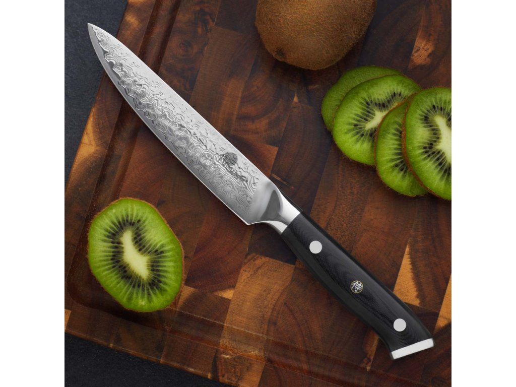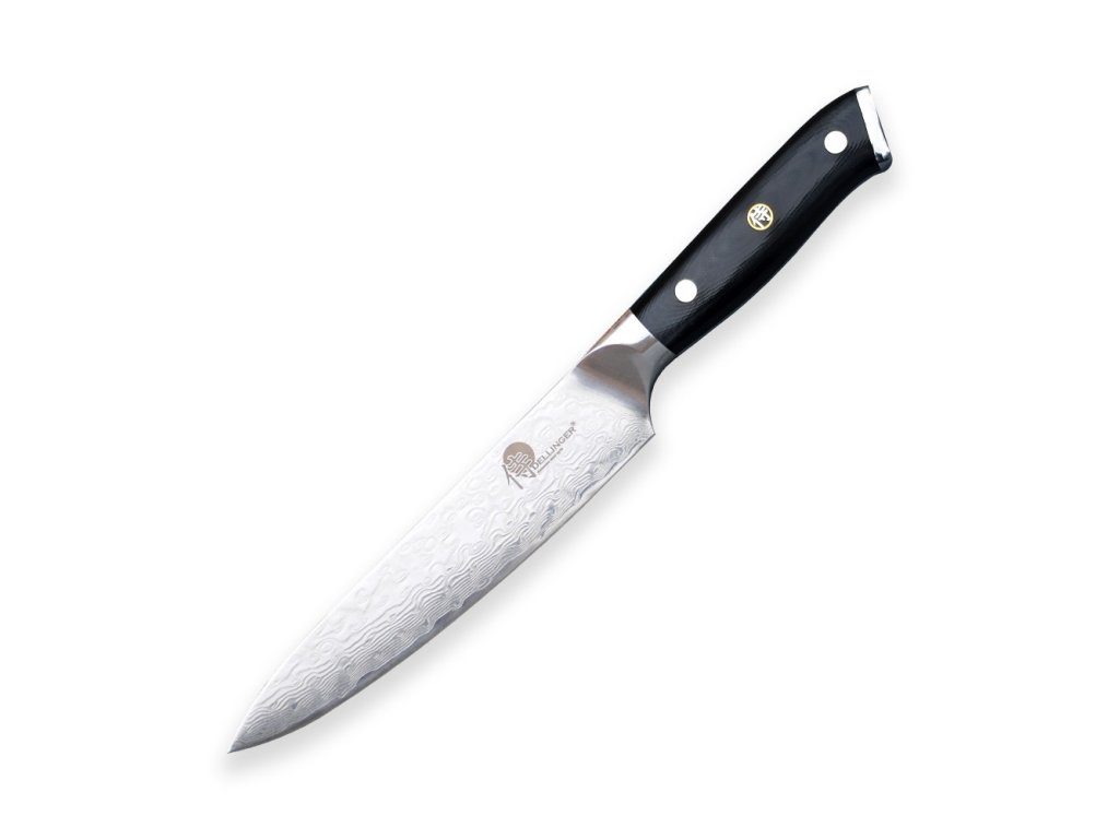 Univerzální nůž Utility ze série Dellinger Samurai z damaškové oceli VG-10, skvělý pro krájení pečiva, masa a zeleniny nebo vykosťování a kuchání ryb a drůbeže. Ergonomická rukojeť z G-10 s ozdobným nýtem zajišťuje pohodlný úchop. Délka ostří 130 mm.