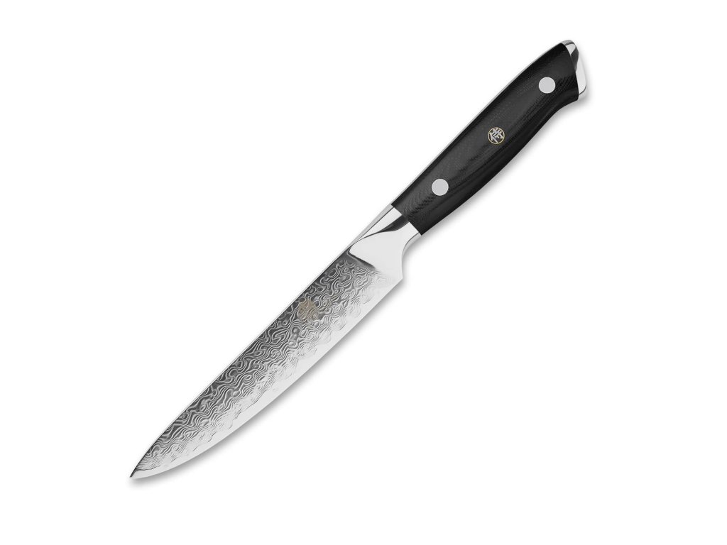 Univerzální nůž Utility ze série Dellinger Samurai z damaškové oceli s jádrem 10Cr15CoMoV - ekvivalent japonské VG-10, s vysokou tvrdostí a výbornou odolností. Skvělý pro krájení pečiva, masa a zeleniny nebo vykosťování a kuchání ryb a drůbeže. Ergonomická rukojeť z G-10 s ozdobným nýtem zajišťuje pohodlný úchop. Délka ostří 130 mm.
