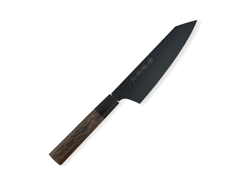 Japonský kuchařský nůž WA-Kengata Santoku s nepřilnavým povrchem Kurokage. Jádro z oceli VG10, s tvrdostí HRC 60-61. Osmihranná rukojeť wengewood, bolster z buvolího rohu. Délka čepele 160 mm.