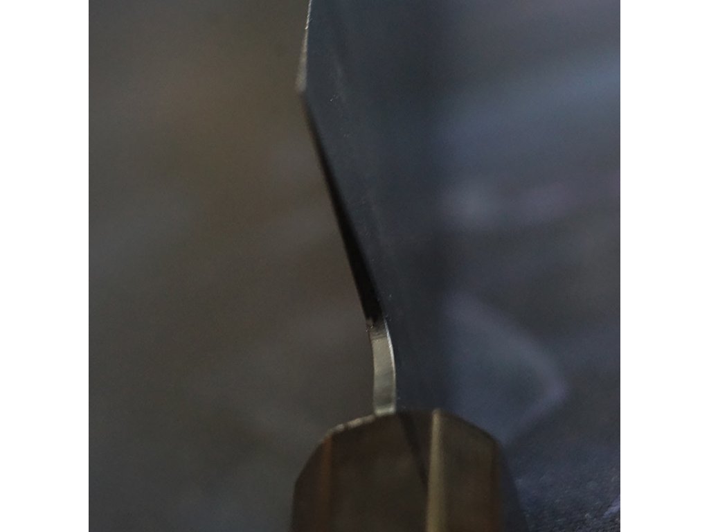 Nerezová ocel s kladívkovým vzorem Tsuchime s jádrem z oceli VG10. Nože ze série Sakai Takayuki Kurokage VG-10 s nepřilnavým povrchem "KUROKAGE" jsou potaženy fluorovou pryskyřicí. Tato vynikající technologie zabraňuje přilnutí krájených surovin na čepel a zároveň je dosaženo extrémní hladkosti povrchu nože. KUROKAGE je překvapivě vývojově pokročilejší technologie, než provedení třeba na známých nožích MAC Non-Stick Coating. Je to proto, protože kladívkovaná, konkávně vypouklá textura na čepeli podporuje nepřilnavou funkci a protože jádro čepele je z prvotřídní nerezové oceli VG10 s tvrdostí 60-61 HRC, která zajišťuje vynikající udržení ostří lépe, než běžná chrommolybdenová nerezová ocel nožů MAC. Bolster je vyroben z rohu vodního bůvola.