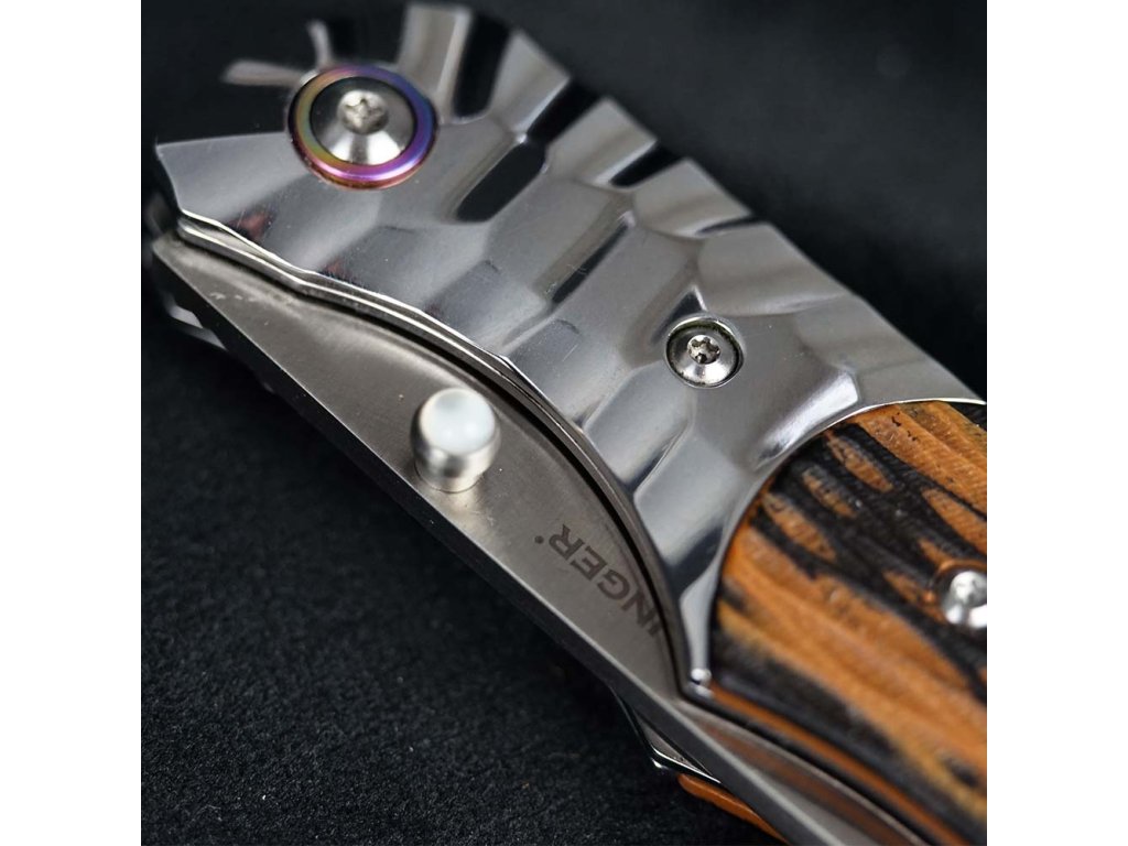 Rukojeť je z odolného materiálu G10 s masivním kováním typu obsidián z nerezové oceli s kroužkem z titanu, což mu dodává luxusní a originální vzhled. K noži je možné zakoupit kožené pouzdro, které je přesně tvarované a nůž v něm perfektně sedí.