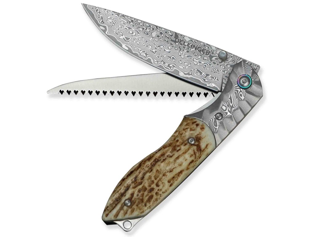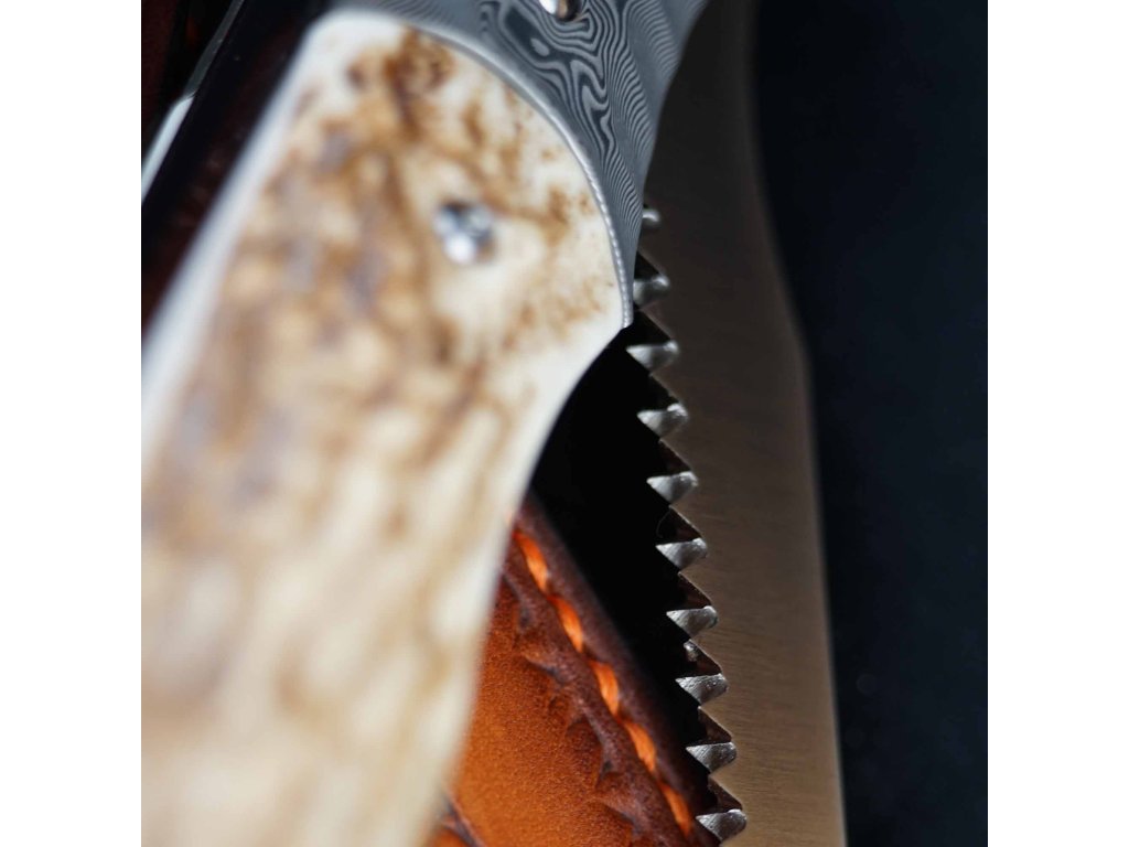 Lovecký zavírací nůž s pilkou Dellinger Wilderer VG-10. Vyroben z japonské damaškové oceli VG-10, rukojeť z paroží. V ceně je také kvalitní kožené pouzdro.
