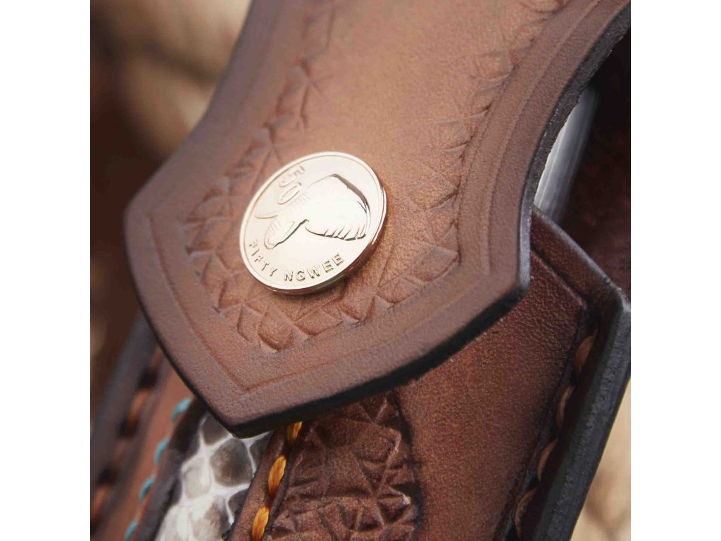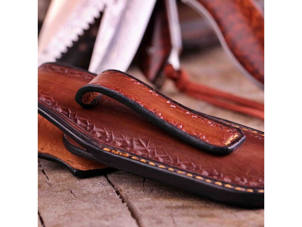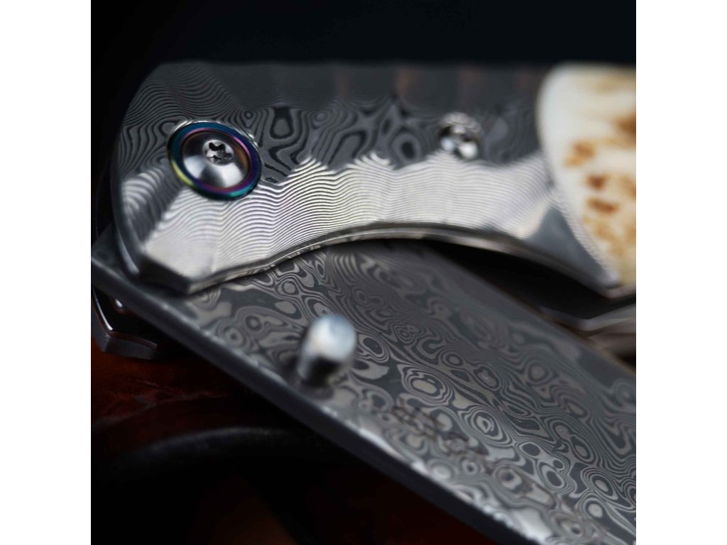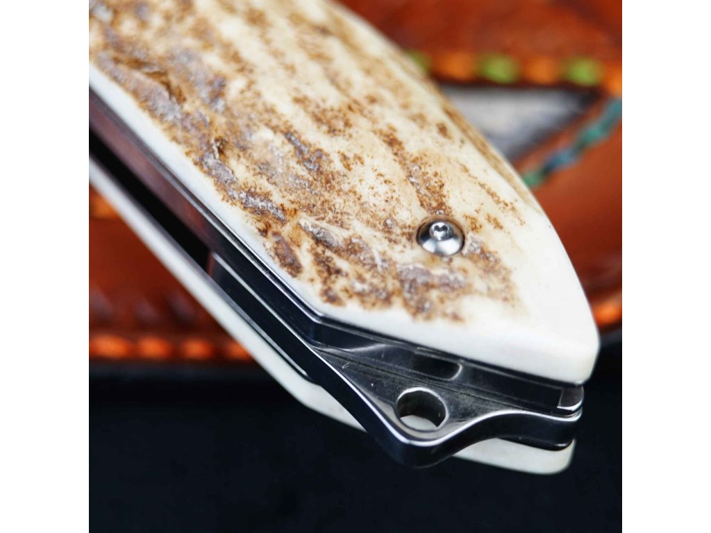 Rukojeť je z pravého paroží s masivním kováním typu obsidián z damaškové oceli s kroužkem z titanu, což mu dodává luxusní a originální vzhled. Nůž je dodávaný s pouzdrem z kvalitní hovězí kůže doplněné kůží kobří.