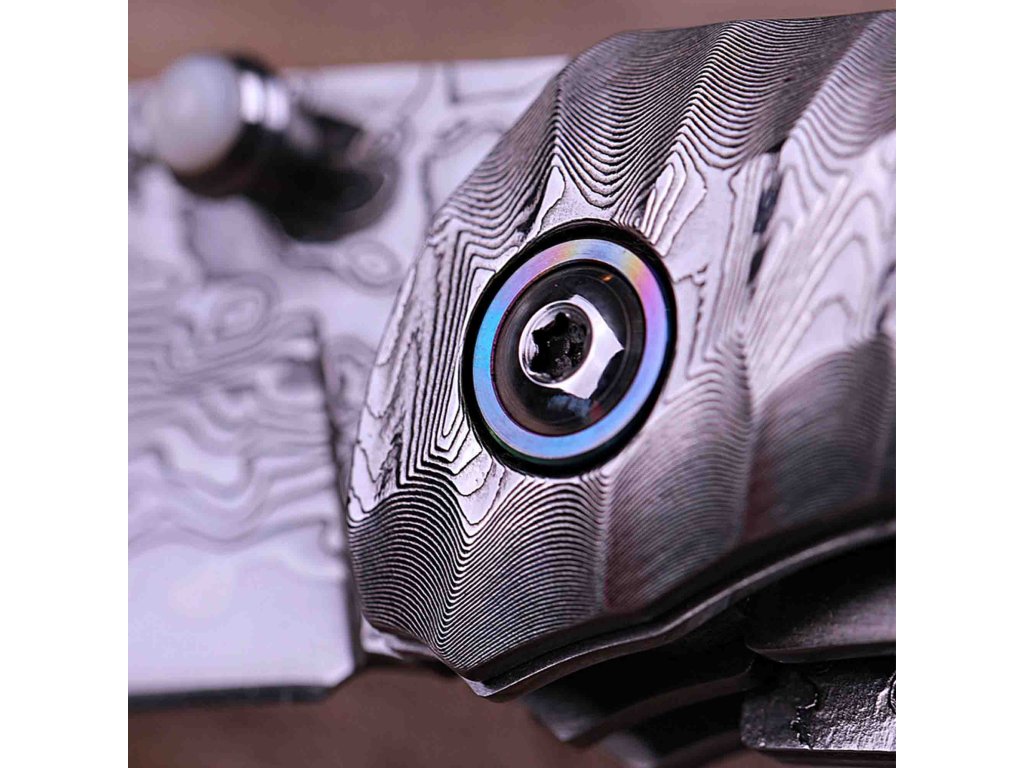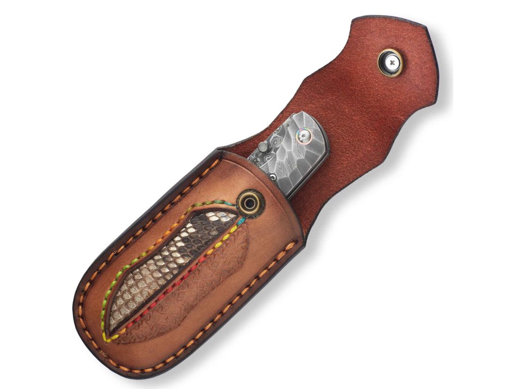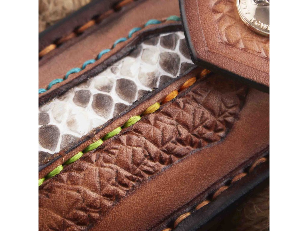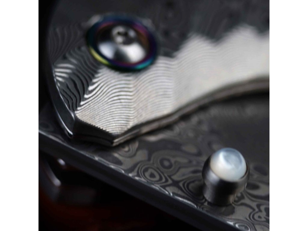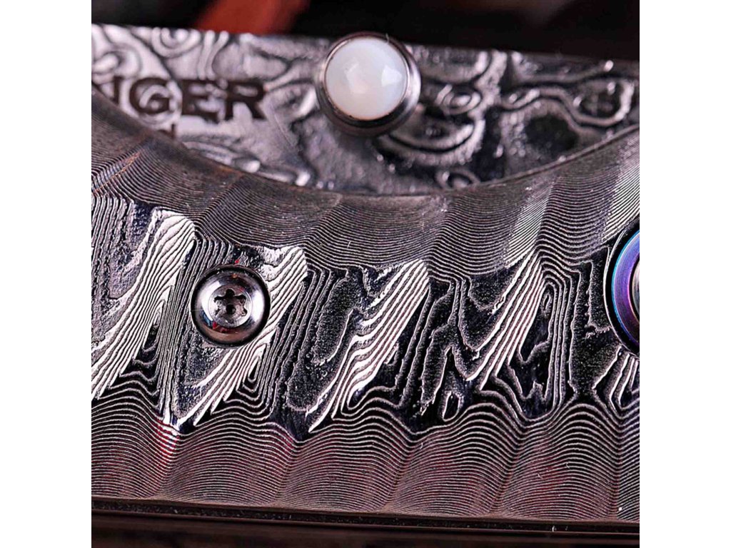 Rukojeť je z pravého paroží s masivním kováním typu obsidián z damaškové oceli s kroužkem z titanu, což mu dodává luxusní a originální vzhled. Nůž je dodávaný s pouzdrem z kvalitní hovězí kůže doplněné kůží kobří.