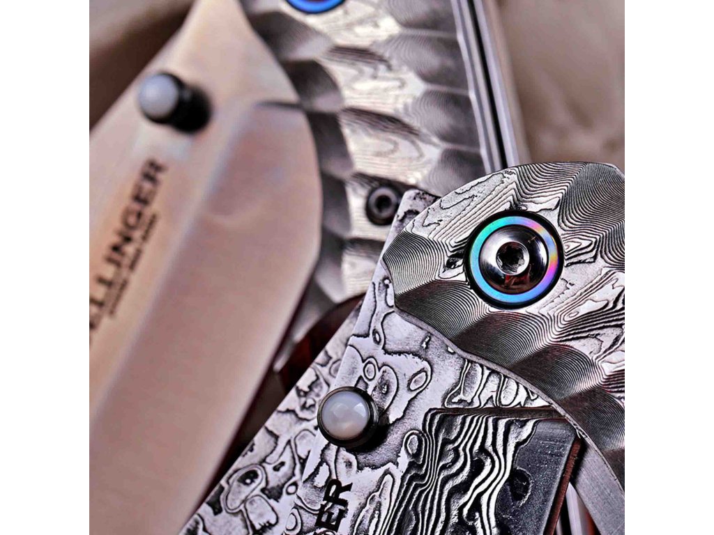 Dellinger Wilderer je ideální lovecký nůž ze skupiny EDC nožů. Má dvě čepele. Jednu ostrou, se kterou nebude žádné krájení, sekání či kuchání problém. Druhou čepelí je potřebná lovecká pilka se dvěma řadami zubů, se kterými nebude problém rozříznout zámek u jakéhokoliv zvířete. Čepel má řezné jádro z VG-10 vložené mezi 66 vrstev 2 nerezových damaškových ocelí. Ocel dosahuje tvrdosti až 61 HRC, je velmi odolná proti opotřebení či korozi a snadno se brousí. Čepel je uložena v kuličkových ložiscích a pevně zajištěna pojistkou linerlock proti samovolnému zavření. Pilka z oceli DC 53 je polouzamčená, v otevřené poloze pevně drží, i když není vybavena pojistkou, a lze ji pohodlně otevřít za špičku.