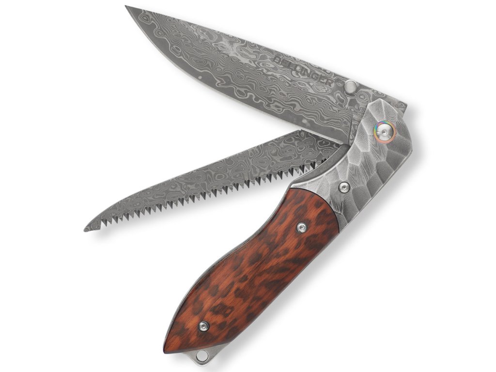 Dellinger Wilderer je ideální lovecký nůž ze skupiny EDC nožů. Má dvě čepele. Jednu ostrou, se kterou nebude žádné krájení, sekání či kuchání problém. Druhou čepelí je potřebná lovecká pilka se dvěma řadami zubů, se kterými nebude problém rozříznout zámek u jakéhokoliv zvířete. Čepel i pilka mají řezné jádro z VG-10 vložené mezi 66 vrstev 2 nerezových damaškových ocelí. Ocel dosahuje tvrdosti až 61 HRC, je velmi odolná proti opotřebení či korozi a snadno se brousí. Čepel je uložena v kuličkových ložiscích a pevně zajištěna pojistkou linerlock proti samovolnému zavření. Pilka je polouzamčená, v otevřené poloze pevně drží, i když není vybavena pojistkou, a lze ji pohodlně otevřít za špičku.