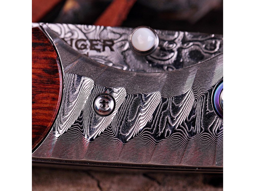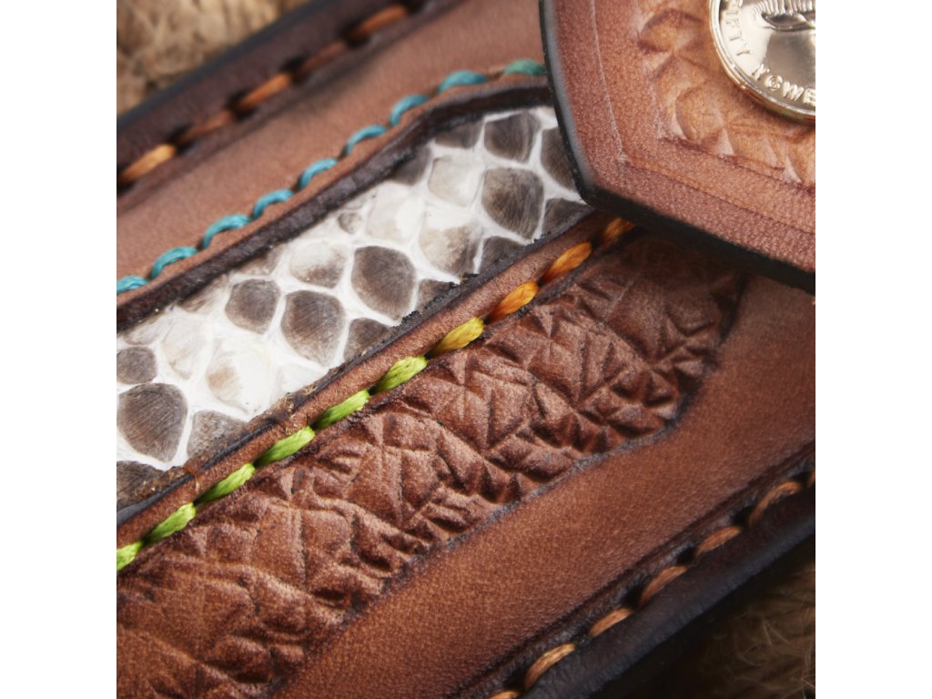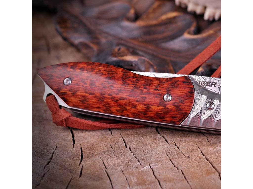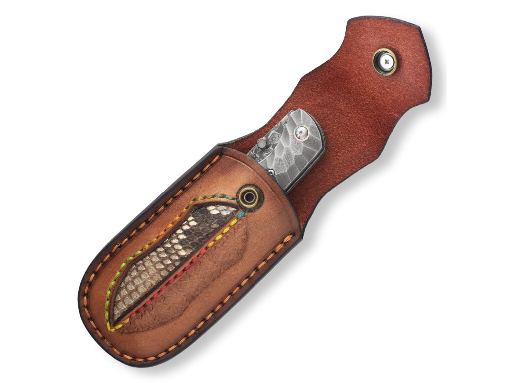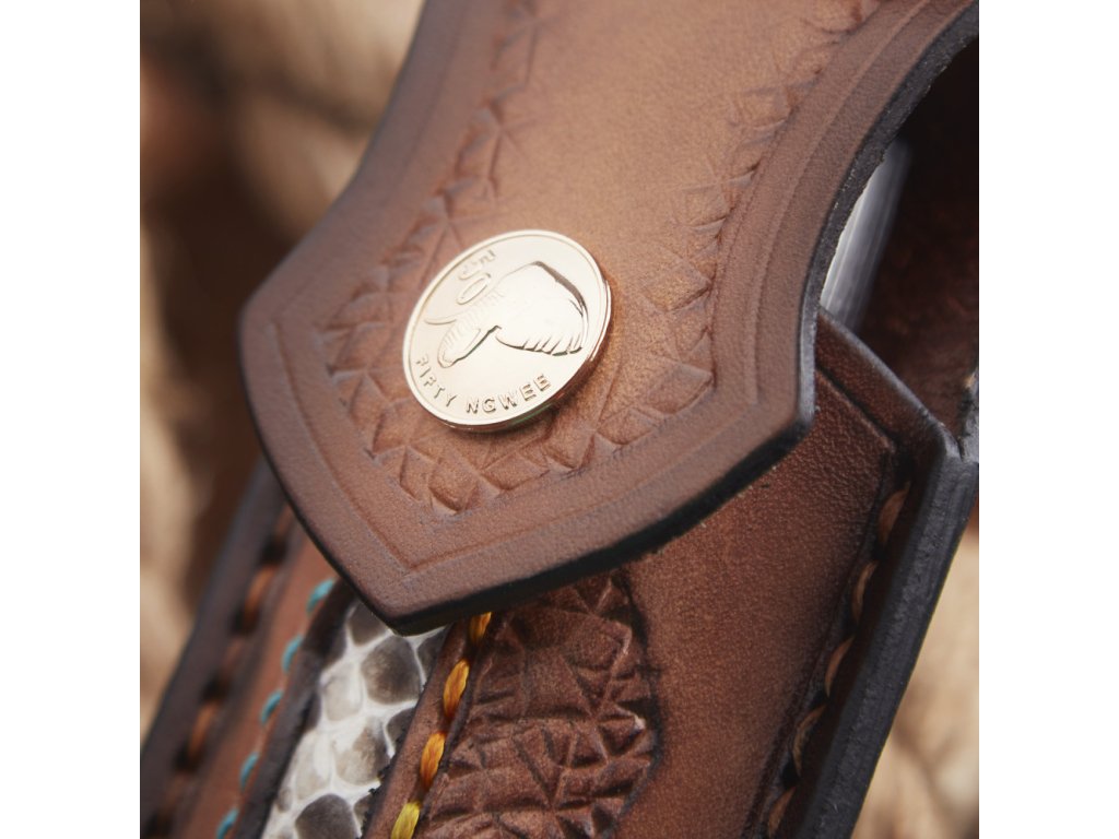 Rukojeť je z pravého hadího dřeva s masivním kováním typu obsidián z damaškové oceli s kroužkem z titanu, což mu dodává luxusní a originální vzhled. Nůž je dodávaný s pouzdrem z kvalitní hovězí kůže doplněné kůží kobří.