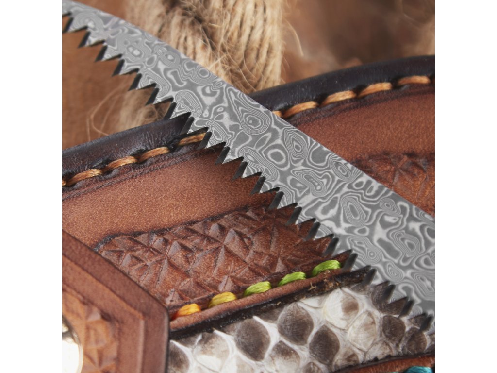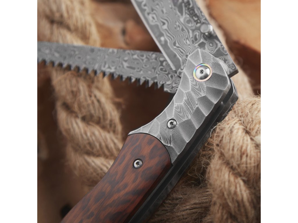 Lovecký zavírací nůž s pilkou Dellinger Wilderer VG-10. Jádro z japonské damaškové oceli VG-0. Rukojeť je vyrobena z hadího dřeva. Včetně kvalitního koženého pouzdra.