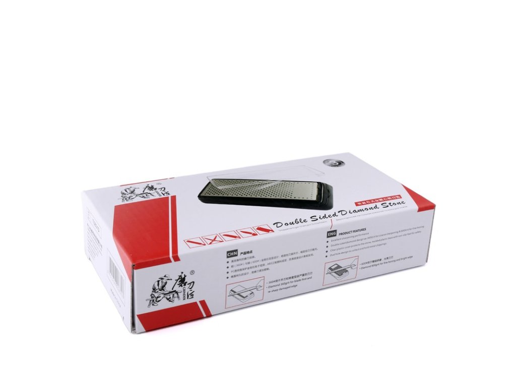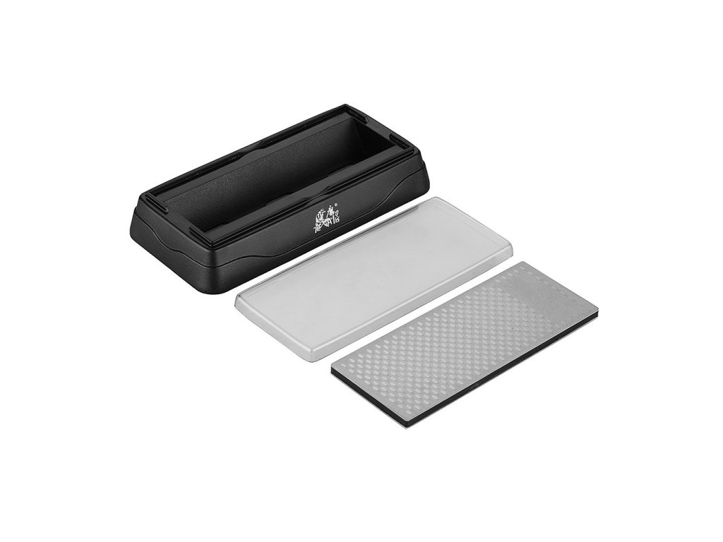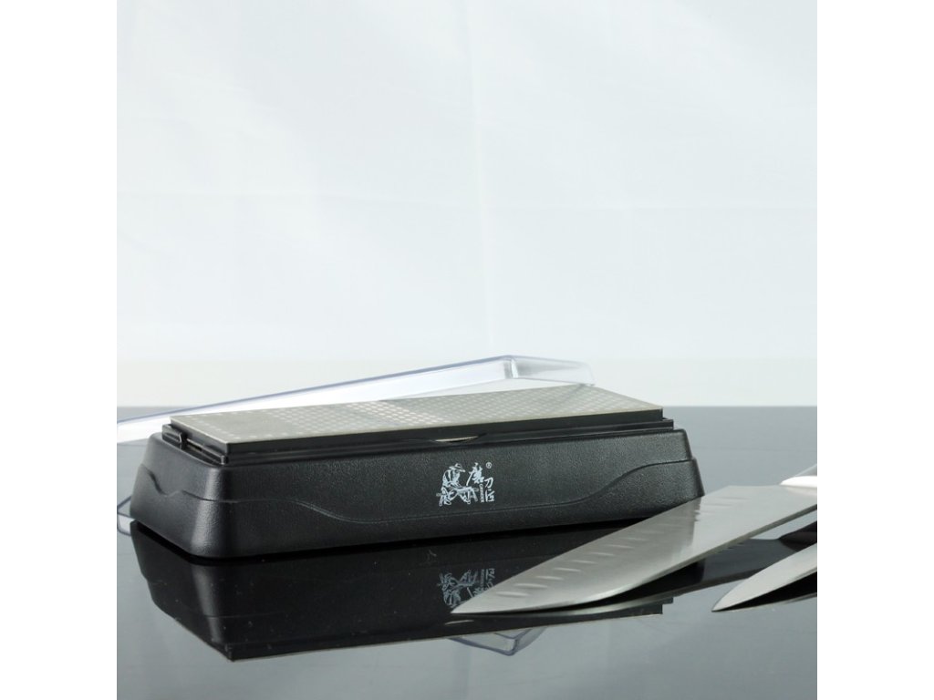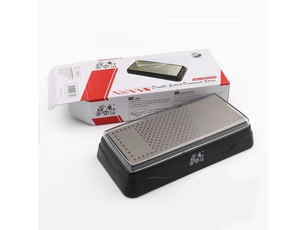 Diamantový oboustranný brusný kámen od společnosti Taidea. Dvě brusné plochy pro velké opravy a jemné broušení. Základna z odolného plastu s protiskluzovým dnem, prostor s otvory pro kovový odbroušený odpad. Hrubosti JIS #360 a #600.