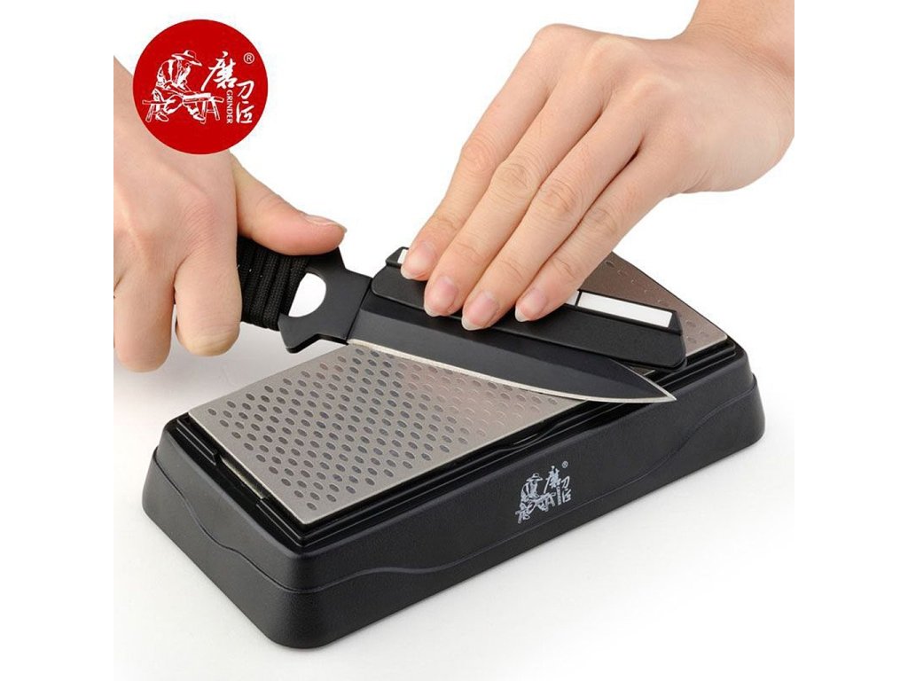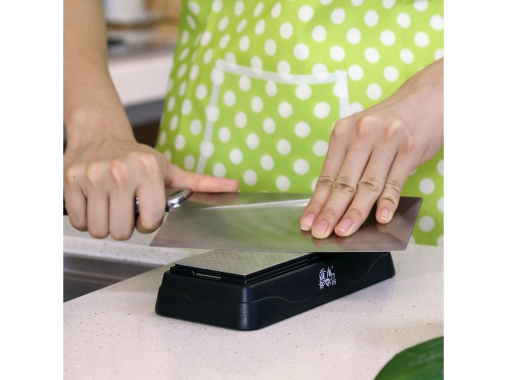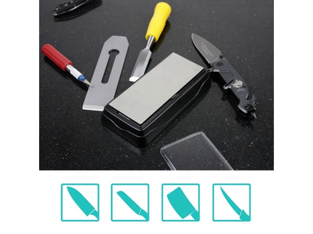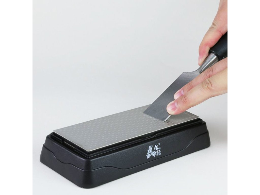 Diamantový oboustranný brusný kámen od společnosti Taidea. Dvě brusné plochy pro velké opravy a jemné broušení. Základna z odolného plastu s protiskluzovým dnem, prostor s otvory pro kovový odbroušený odpad. Hrubosti JIS #360 a #600.