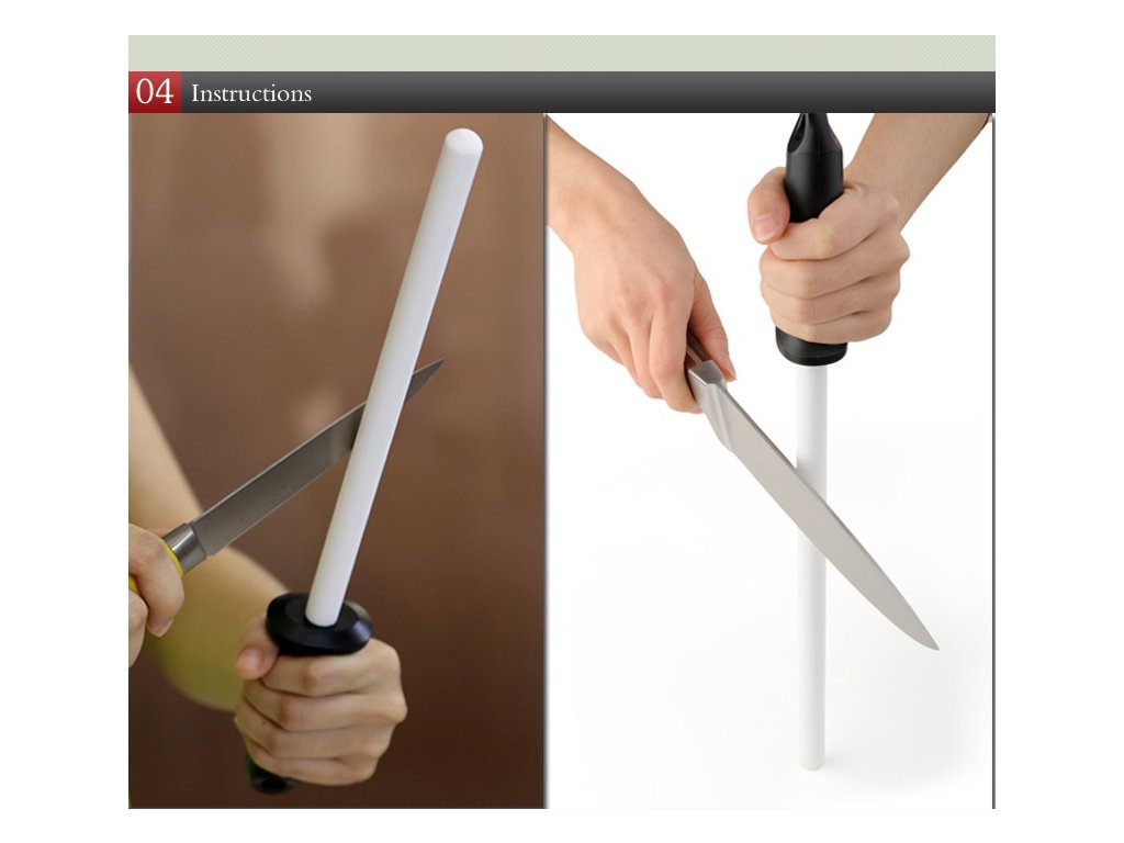 Umístěte plastový hrot na konci ocílky na pevný a odmaštěný povrch. Přitlačte směrem dolů, abyste zabránili sklouznutí během používání. Volným tahem (bez použití tlačné síly) pod úhlem cca 20 stupňů několikrát opakujte přejížděním fazety ostří nože na povrchu ocílky. Ostřete nůž od paty nože, až ke špičce, a opakujte 2-3 krát, pak otočte na druhou stranu nože, dokud nebude ostří dostatečně ostré.