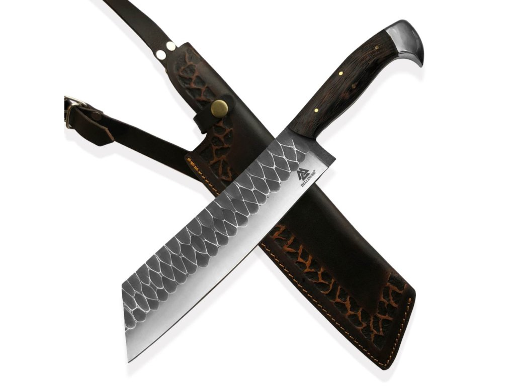 Kovaná mačeta Hacke Chopper D2 s čepelí z nástrojové oceli D2 s povrchovou úpravou black stonewashed a rukojetí ze dřeva Wenge. Extrémně odolný nástroj pro bushcraft, outdoor dobrodružství a survival. Dodávána s kvalitním koženým pouzdrem.