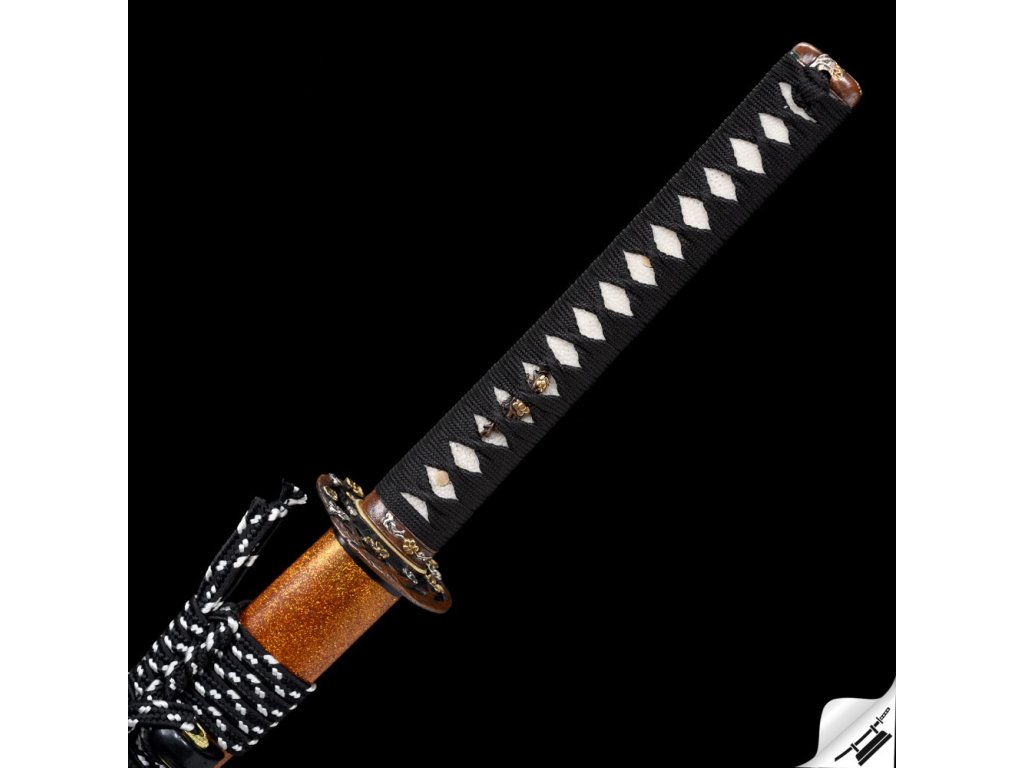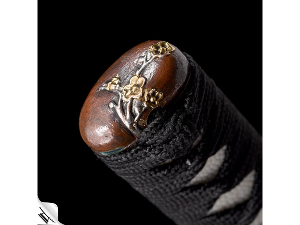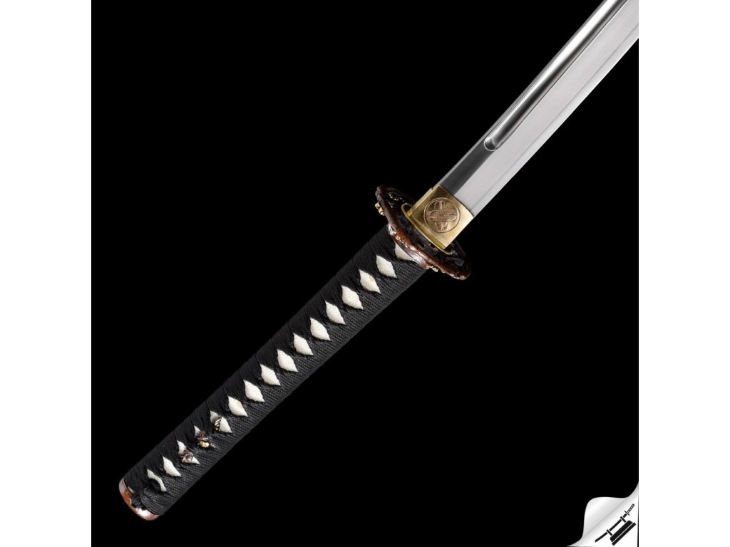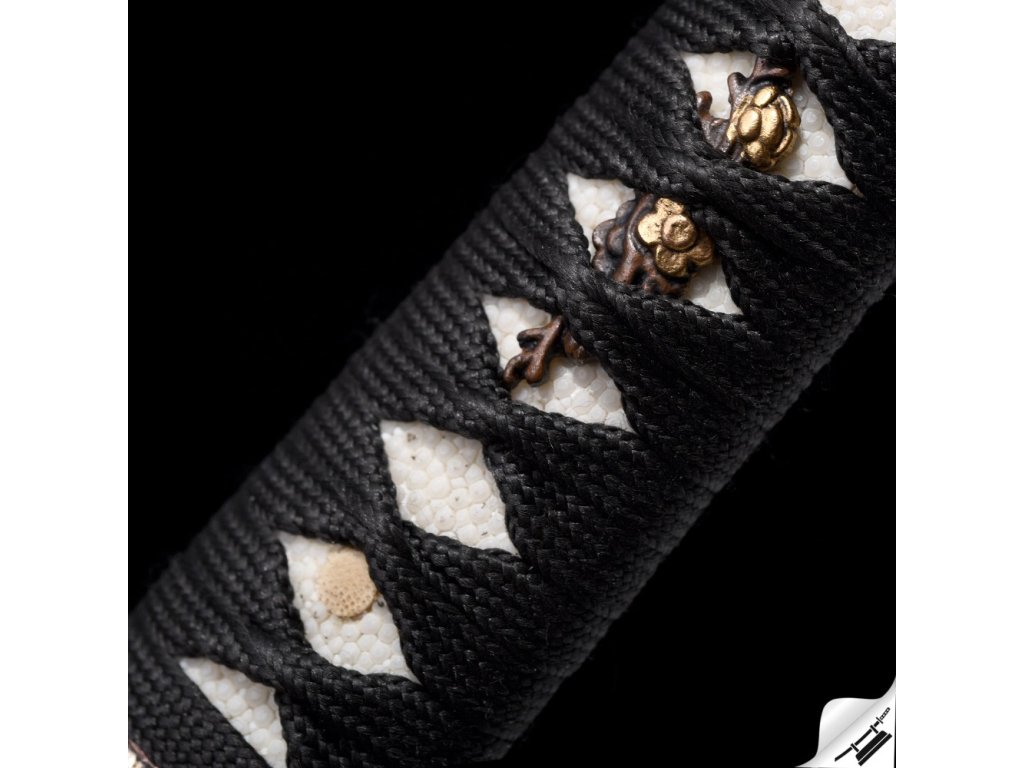 • Tsuka (rukojeť) - dřevěné jádro, potažena pravou rejnočí kůží (Samegawa), s černou omotávkou. Čepel zajištěna 2 bambusovými kolíky "mekugi".