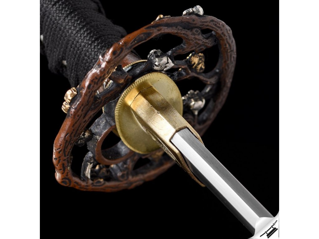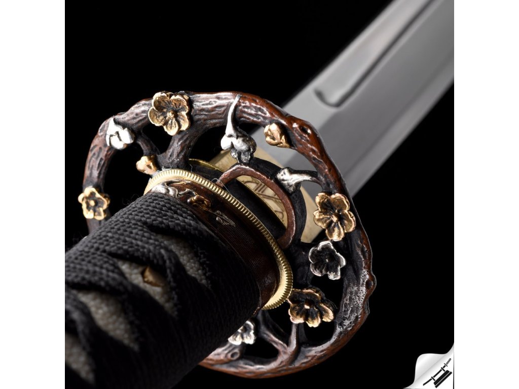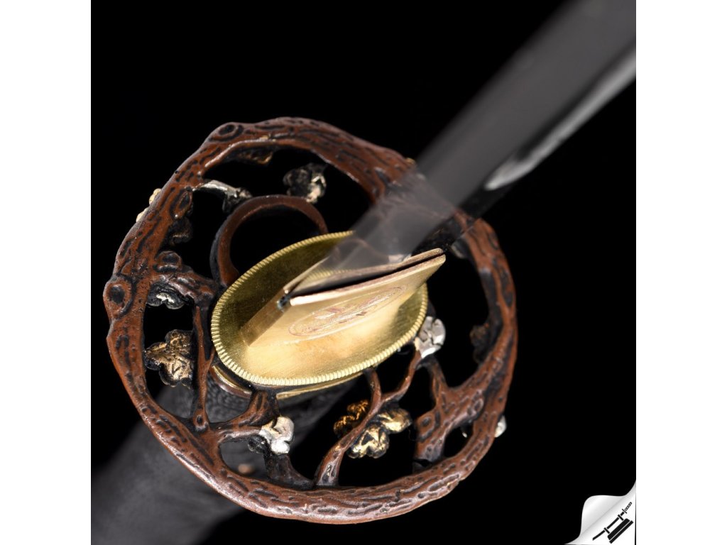 Kovaná čepel z oceli T-10 té nejvyšší kvality. Ocel byla laminována v monokompositní konfiguraci Maru - diferenciálně tvrzená. Uhlíková ocel T-10 (obsah 1,1% uhlíku a 0,4% manganu) je velmi pevná a skvěle drží ostrost. Čepel se žlábkem bo-hi byla ve finální fázi ručně leštěna kamenem hazuya - tím je dosaženo téměř žiletkového ostří (razor sharp) a zrcadlového lesku. Výrazný reálný Suguha hamon je tvořen dle dávných tradičních metod, které vychází z mnohaletých zkušeností kovářského mistra, který výrobou této nádherné zbraně strávil několik dnů. Vše na tomto meči je individuálně zhotoveno, včetně saye a habaki, jsou použity nejkvalitnější komponenty, včetně špičkového laku na sayu, japonského hedvábí a skutečné rejnočí kůže nejvyšší kvality. Jedná se o špičkovou repliku samurajského meče, která je vhodná k sekovým zkouškám a lze ji rozložit na jednotlivé části. Tato čepel byla vyzkoušena a testována tak, aby odstranila vše co jí stojí v cestě ! Sori (zakřivení čepele) je speciálně navrženo tak, aby bylo dosaženo co možná nejjemnějších a nejčistších řezů. To vše v kombinaci s výběrem tradičního kovaného Koshirae zaručuje, že získáte to nejlepší z hlediska vzhledu i funkčnosti. Uhlíková ocel T-10 má působivou tvrdost HRC 58 - perfektní kombinace této tvrdosti je podtrženo zakřivením čepele Sori, které umožňuje snadné přeseknutí tatami, slaměné rohože, nebo bambusu pro tameshigiri. Full tang konstrukce této katany výrazně zvyšuje sílu meče. Čepel je typu shinogi-zukuri, tento typ čepele se vyrábí od 10.století našeho letopočtu. Hrot meče o kissaki se skutečným Diamond-Shaped Yokote, které je velmi dobře definováno tím, že hamon prochází po celé délce přes Boshi. Yokote je velmi důležité pro strukturální integritu špičky meče. Pomáhá absorbovat otřes, rozptýlí sílu a přispívá k stabilitě a síle meče při tzv. sekořezu. Tato katana (samurajský meč) je vhodná na použití v praxi, firma Dellinger se však zříká jakékoliv odpovědnosti za zranění a poškození vzniklá při použití. Schraňujte mimo dosah dětí ! Jakákoliv manipulace se samurajským mečem je na vaší vlastní odpovědnost. Nezapomeňte, že máte ve svých rukou smrtící zbraň !