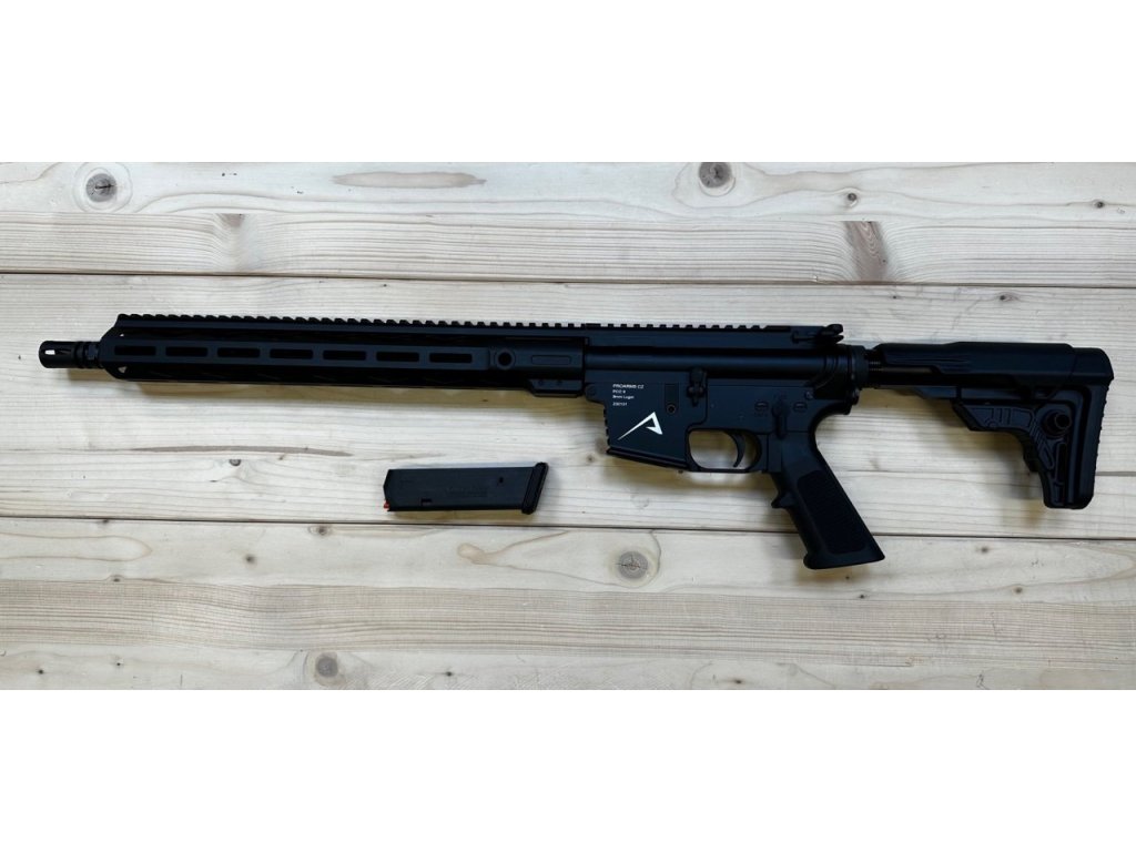 Samonabíjecí puška "PCC" na bázi pušek AR/MSR v ráži 9mm Luger na zásobníky Glock (1ks na 17 ran v ceně). Předpažbí 14" (356mm) se systémem M-LOK pro delší úchop při střelbě dynamických disciplín, teleskopická pažba S4, oboustranné poutko pro jednobodý popruh, hlaveň v délce 16" (406mm) s povrchovou úpravou QPQ, tlumičem výšlehu A2, závitem 1/2"-36 (k dispozici tlumiče A-TEC SMG) Zbraň je vybavena střeleckou pohotovostí a nabízí kvalitní zpracování, spolehlivost a bezkonkurenční poměr ceny/kvality! Celková délka zbraně vč. ústového zařízení je 815mm při zasunuté pažbě. V případě zájmu může být zbraň dodána s pouzdrem od Uncle Mikes, Blackhawk! nebo Black Eagle za zvýhodněnou cenu 1 300,- vč. DPH !