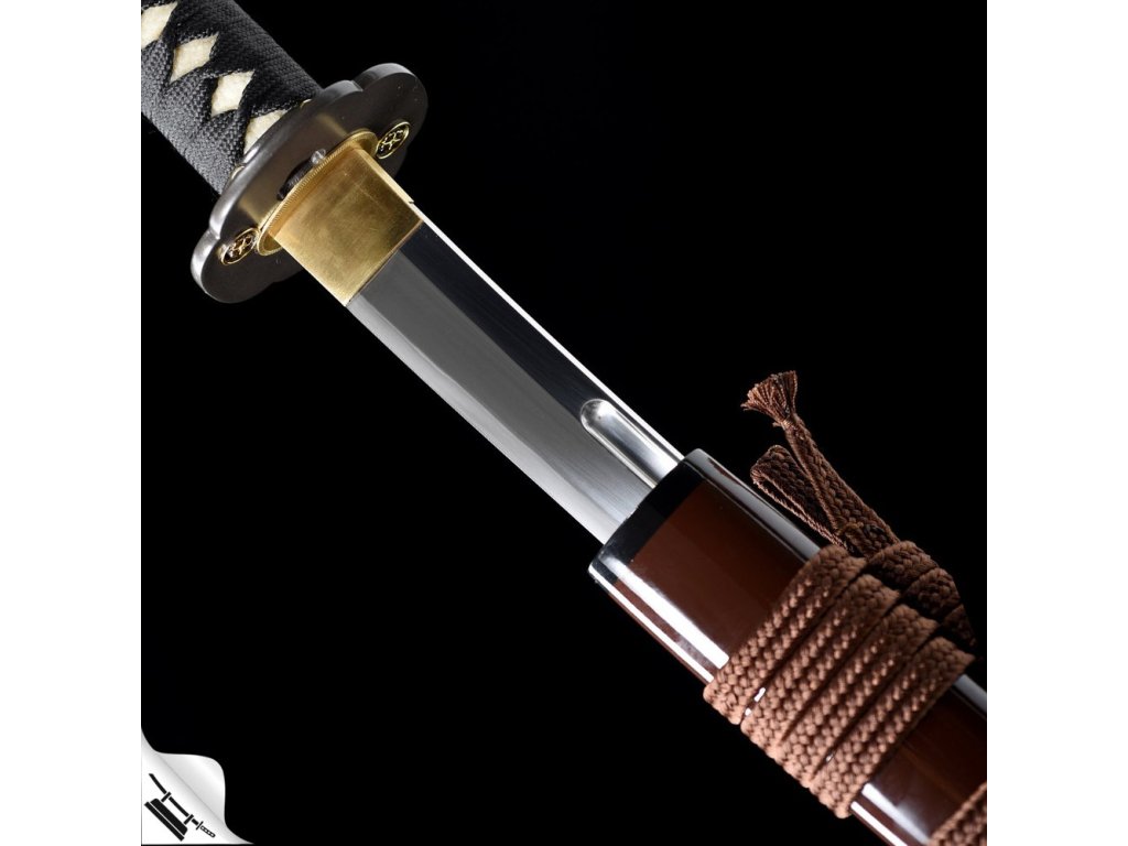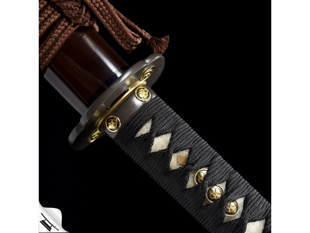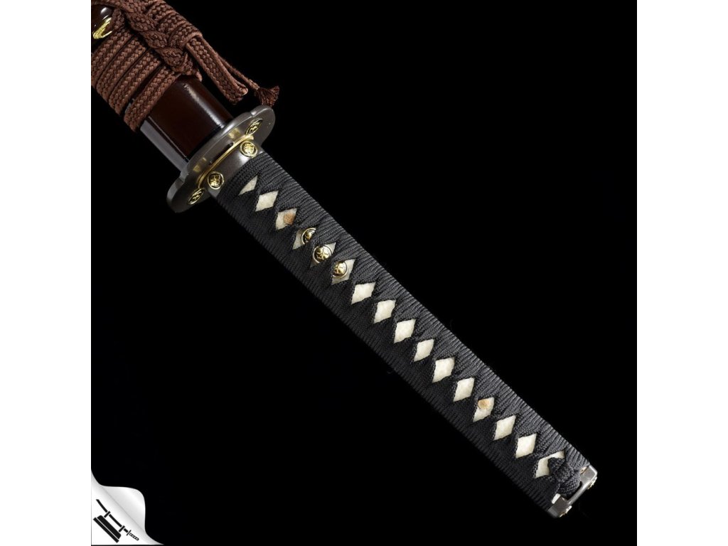 • Tsuka - dřevěné jádro, potažena pravou rejnočí kůží (Samegawa) s hedvábnou černou omotávkou ITO. Čepel zajištěna 2 bambusovými kolíky "mekugi".