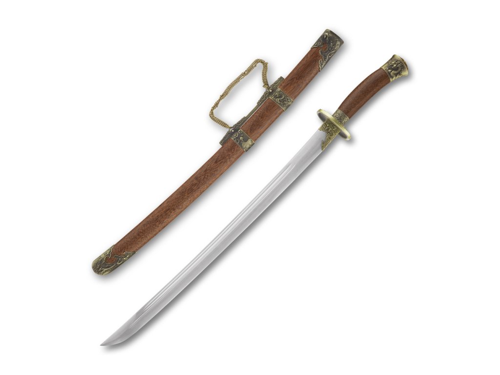 Replika čínské šavle dynastie Ming a Qing, uhlíková ocel AISI 1095, dřevěná pochva se zdobením