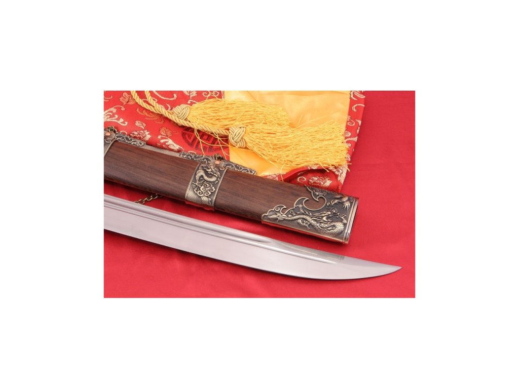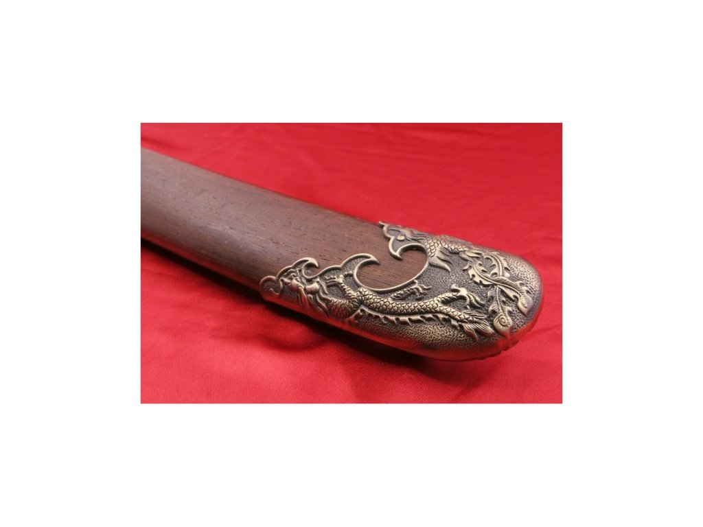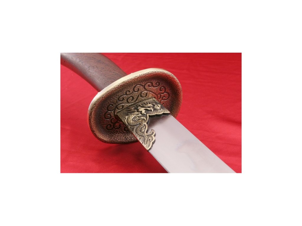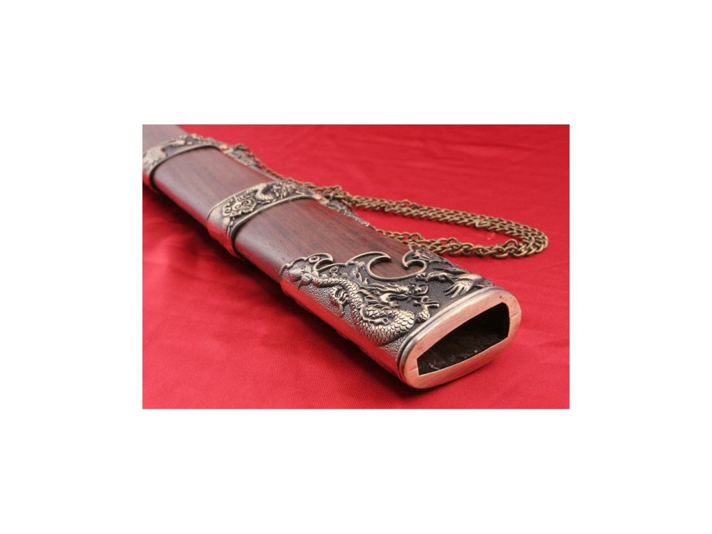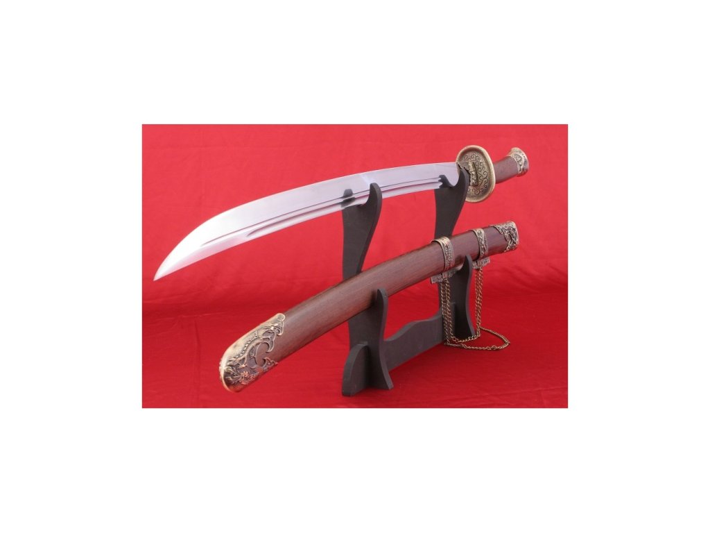 Tradiční čínská šavle inspirovaná obdobím dynastií Ming a Qing je ručně kovaná z uhlíkové oceli AISI 1095. Ostřená čepel s dvojitým žlábkem zajišťuje dobré vyvážení i funkčnost. Dřevěná rukojeť s kovovou záštitou a dračí hlavicí dodává šavli na výrazu. Dodává se v bohatě zdobeném dřevěném pouzdru. Skvělá volba pro trénink, sběratelství i jako stylová dekorace podporující rovnováhu těla i mysli. Celková délka 880 mm.