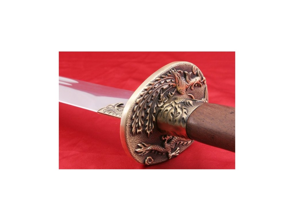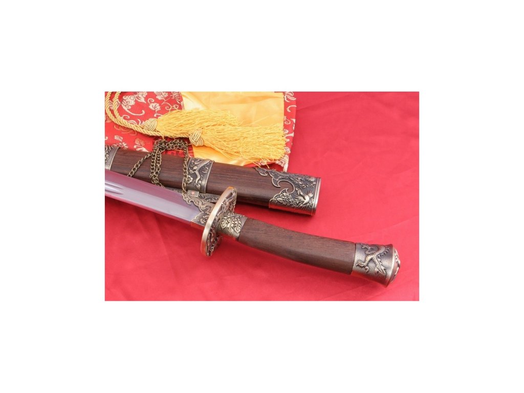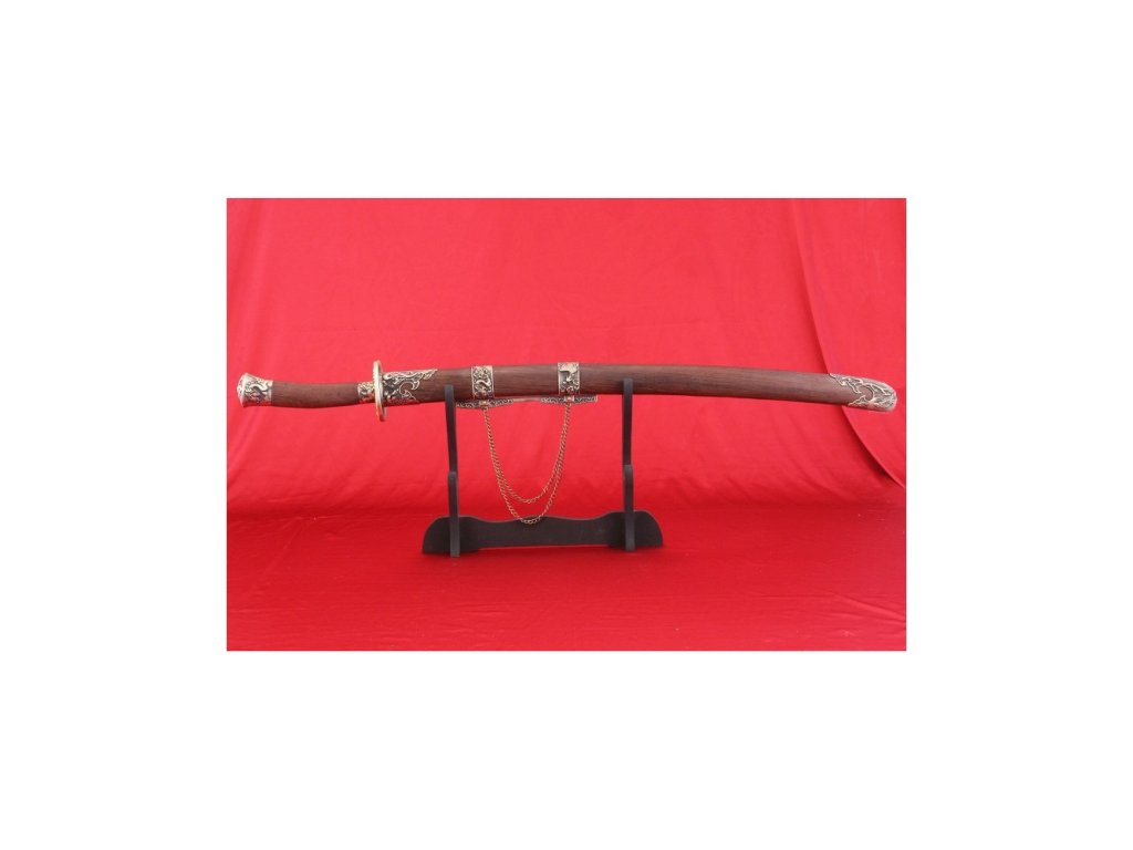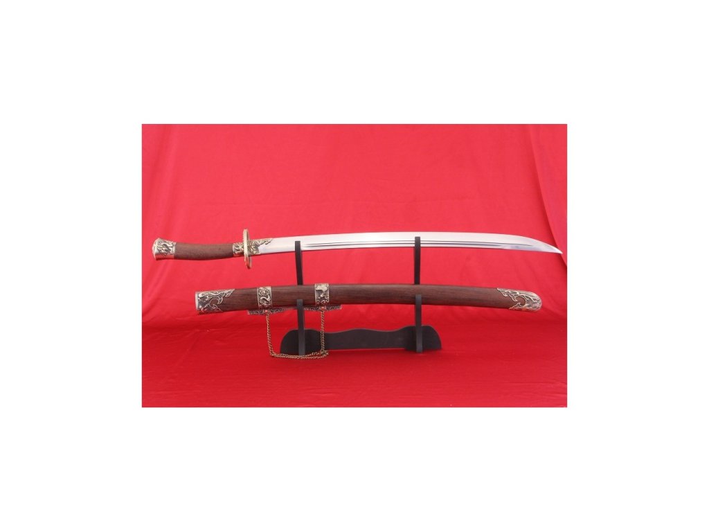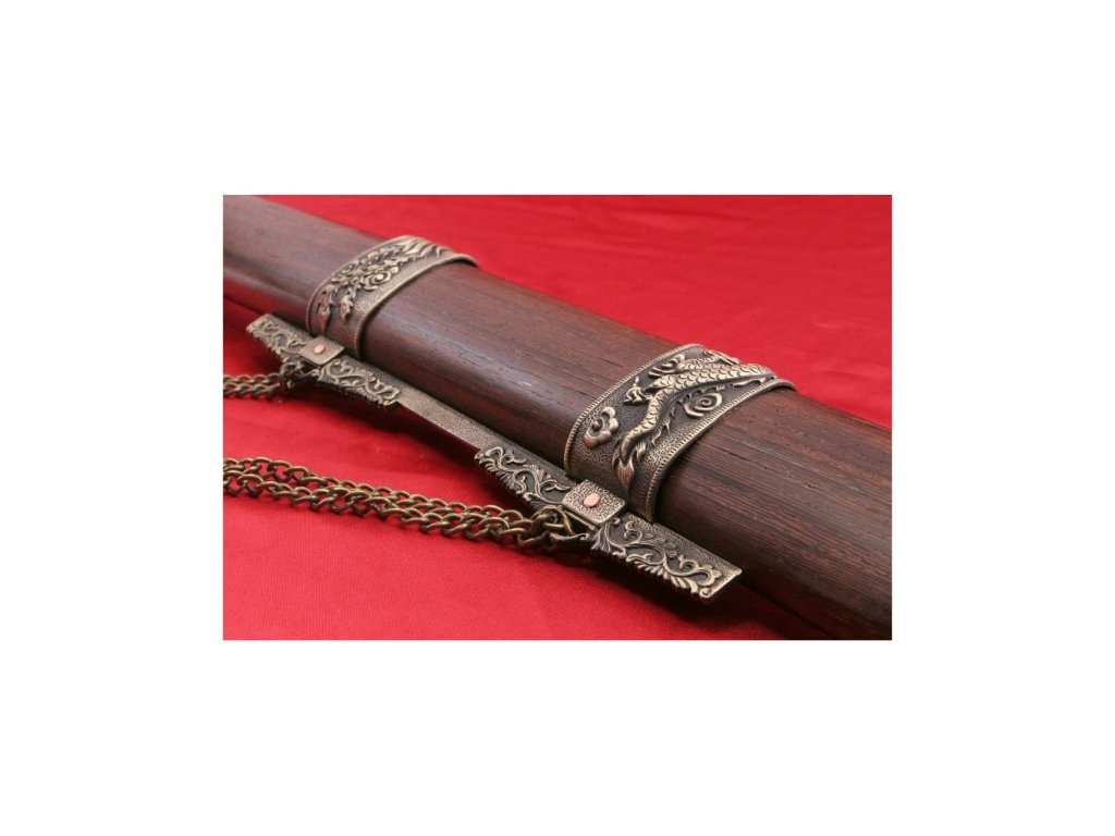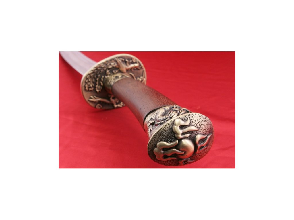 Tradiční čínská šavle inspirovaná obdobím dynastií Ming a Qing je ručně kovaná z uhlíkové oceli AISI 1095. Ostřená čepel s dvojitým žlábkem zajišťuje dobré vyvážení i funkčnost. Dřevěná rukojeť s kovovou záštitou a dračí hlavicí dodává šavli na výrazu. Dodává se v bohatě zdobeném dřevěném pouzdru. Skvělá volba pro trénink, sběratelství i jako stylová dekorace podporující rovnováhu těla i mysli. Celková délka 880 mm.