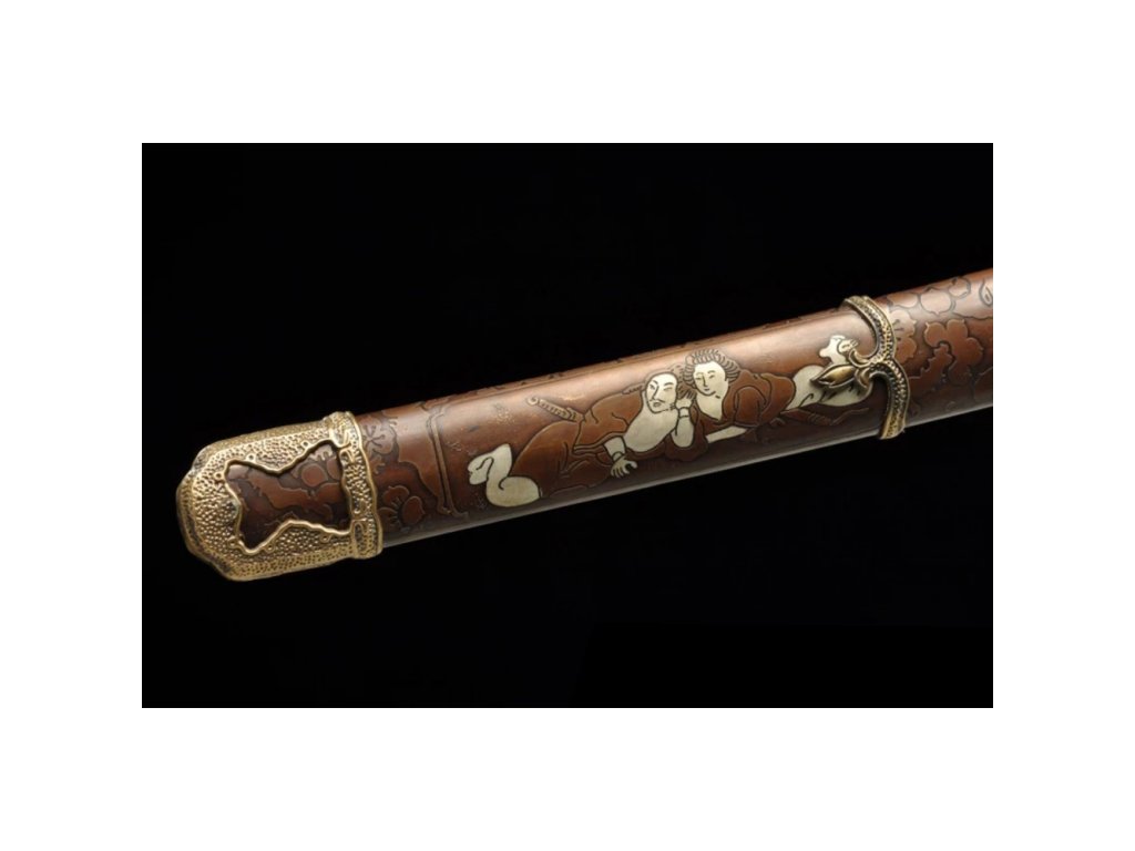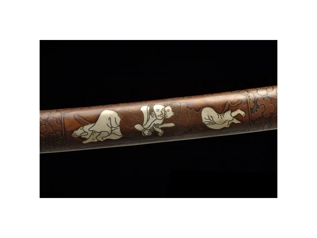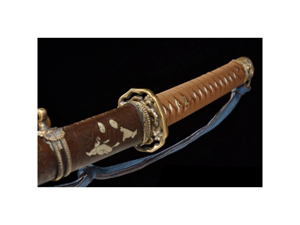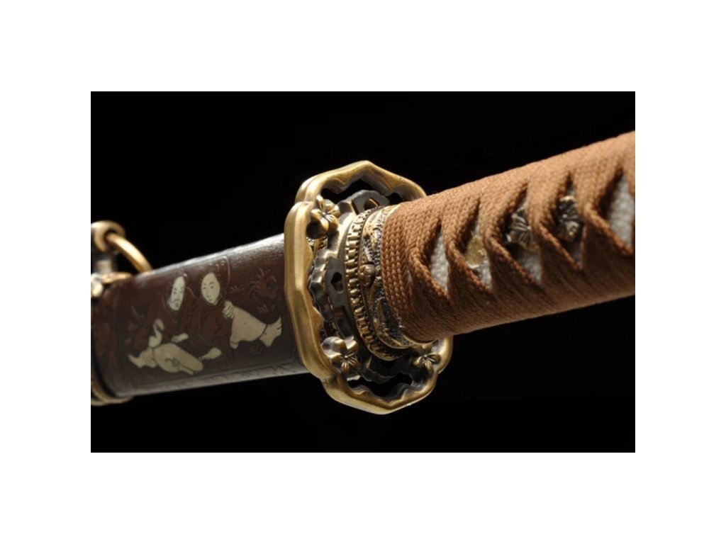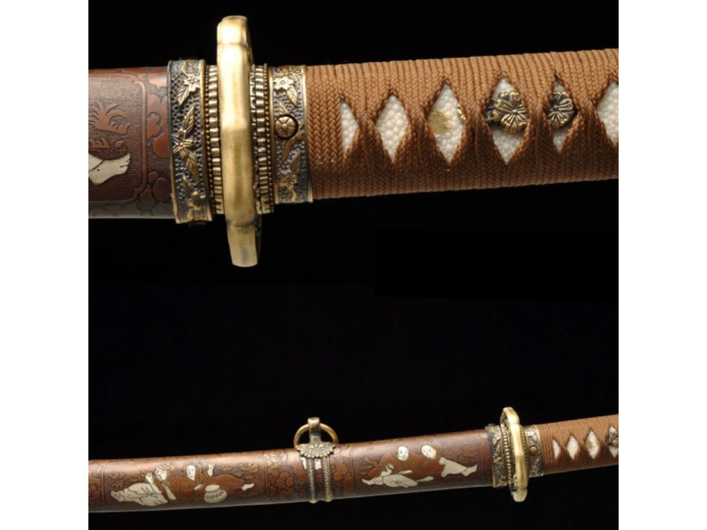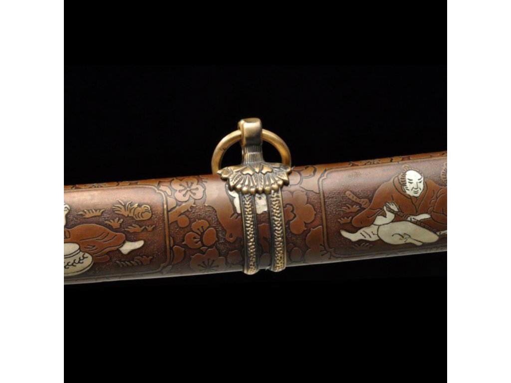 Pouzdro je lakovaný kov s překrásnými kresbami. Místo sagea je na pouzdru meče mosazný kroužek pro lepší nošení. Kashira, fuchi a tsuba, koiguchi a kojiri jsou mosazné. Habaki je mosazné s drážkami.