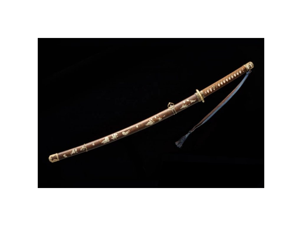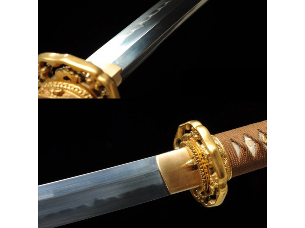 Funkční replika meče Gunto s čepelí z uhlíkové oceli AISI 1095 zaujme nejen ostrostí, ale i skutečným hamonem typu Midare, který vznikl parciálním zakalením. Čepel dlouhá 70 cm je bezpečně uchycena bambusovým kolíkem a snadno demontovatelná. Rukojeť s pravou rejnočí kůží a hnědým hedvábným opletem je doplněna skrytými ornamenty. Pouzdro z lakovaného kovu je zdobeno kresbami a místo sagea má mosazný kroužek pro snadné přenášení. Dekorativní prvky z mosazi dodávají meči autentický vojenský vzhled. Celková délka 1020 mm.