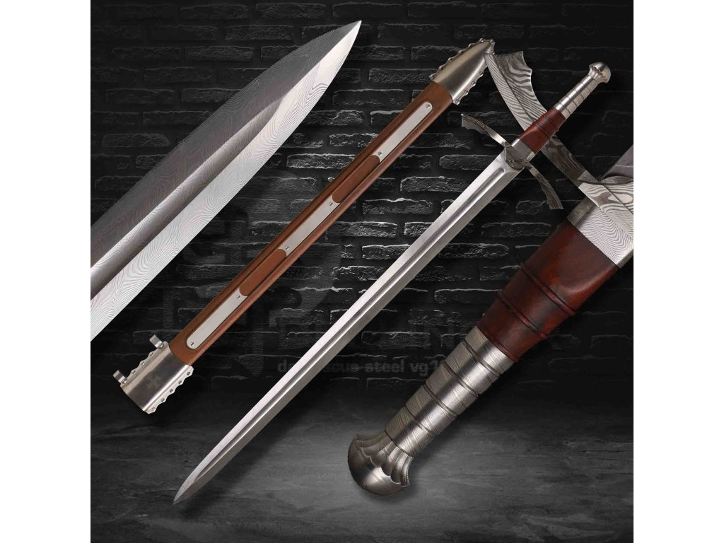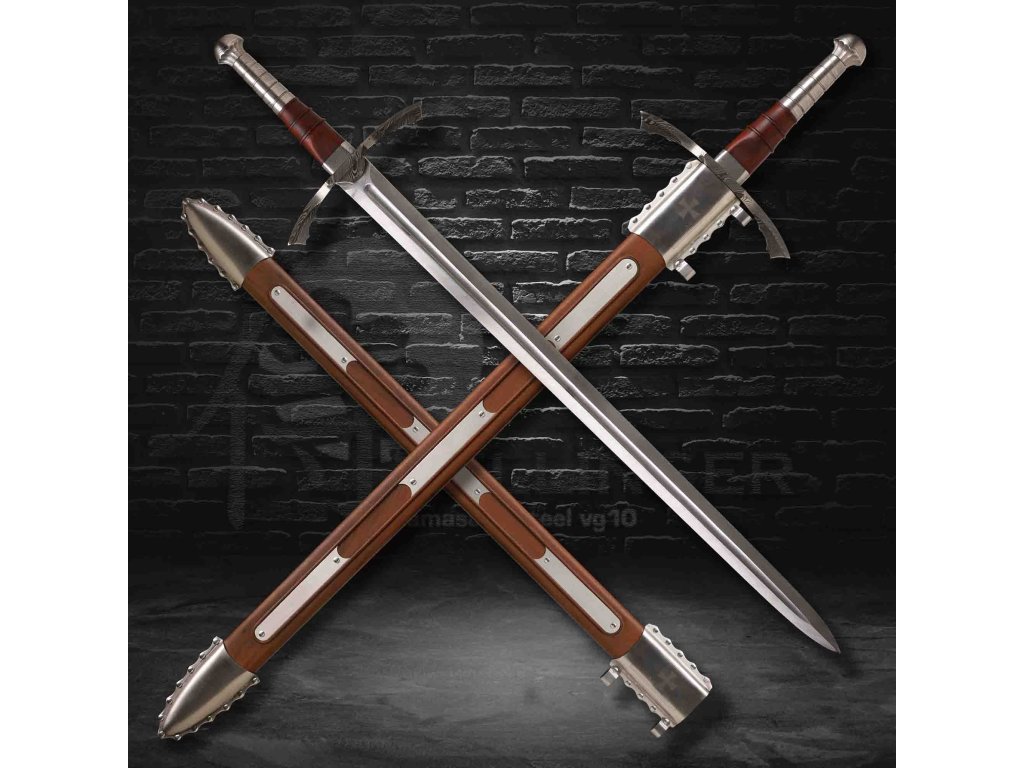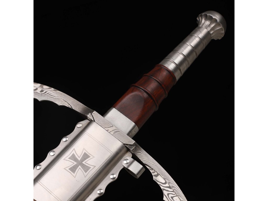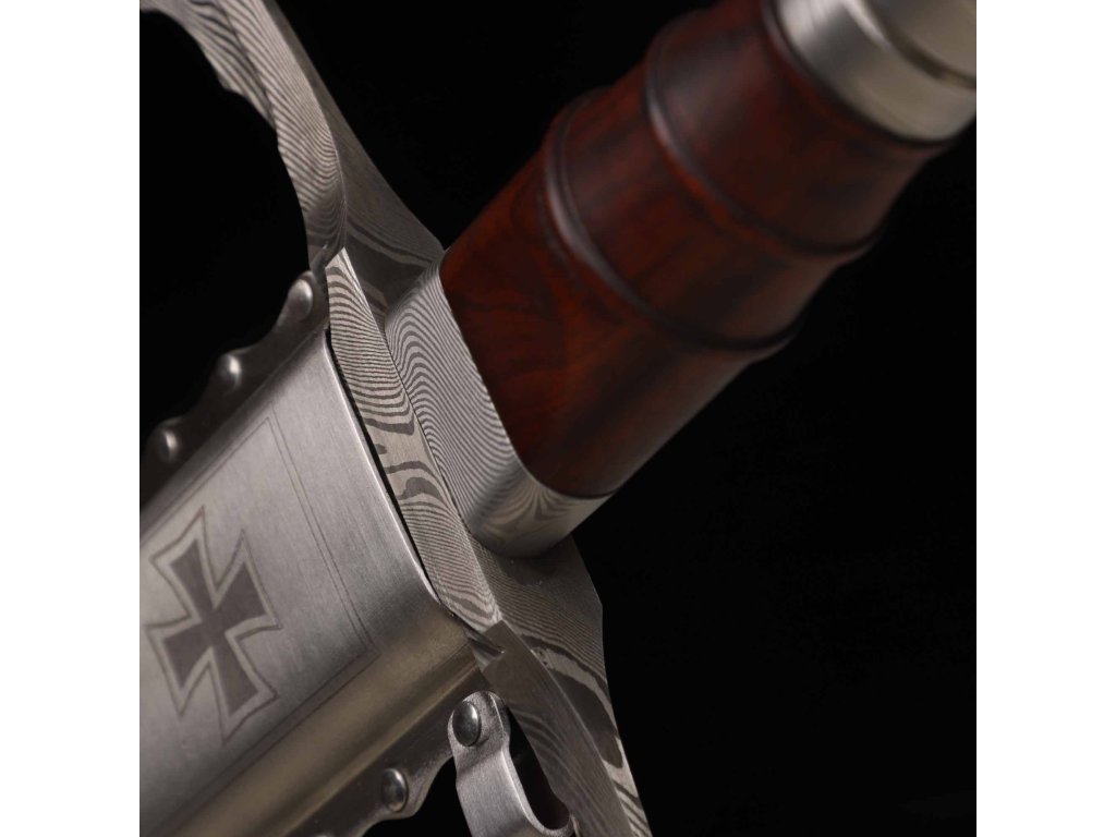 Dlouhá, rovná a oboustranně broušená čepel, která je ideální pro sekání i bodání. Pro čepel byla použita velmi kvalitní damašková ocel s výrazným vrstveným vzorem o délce 700 mm. Jílec s lehce zakřivenou damaškovou příčkou, která chrání ruku bojovníka před údery protivníka. Dostatečně dlouhá rukojeť, tak aby ji bylo možné uchopit oběma rukama, což zajistí lepší kontrolu a sílu úderu. Zdobená damašková hlavice skvěle vyvažuje a zakončuje meč. Dřevěná pochva s kováním a zdobením nese křižáckou symboliku. Křižácký meč je ideální dárek, může se stát sběratelským kouskem nebo dekorací, ale zároveň se jedná o zdařilou a plně funkční repliku bojového meče.